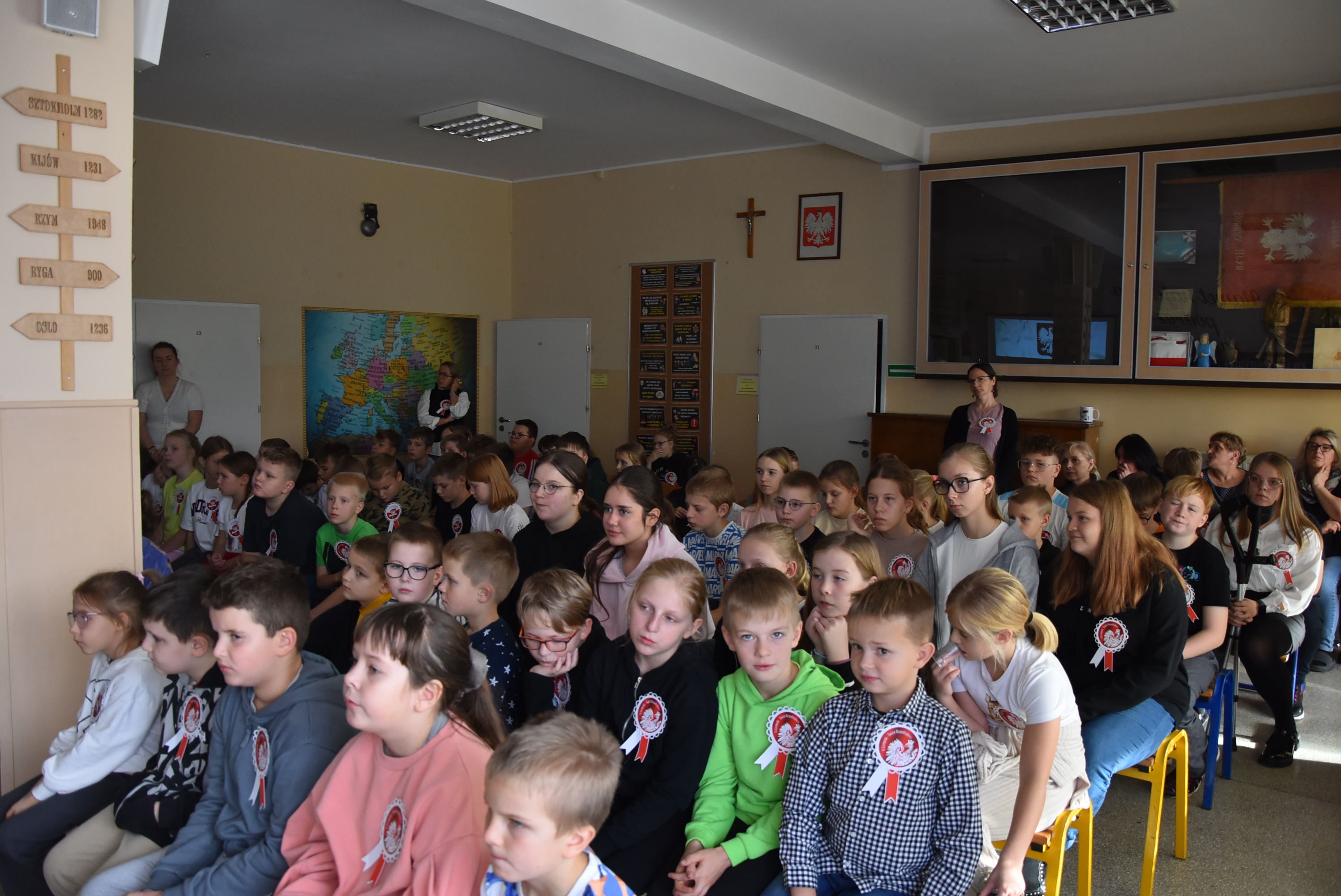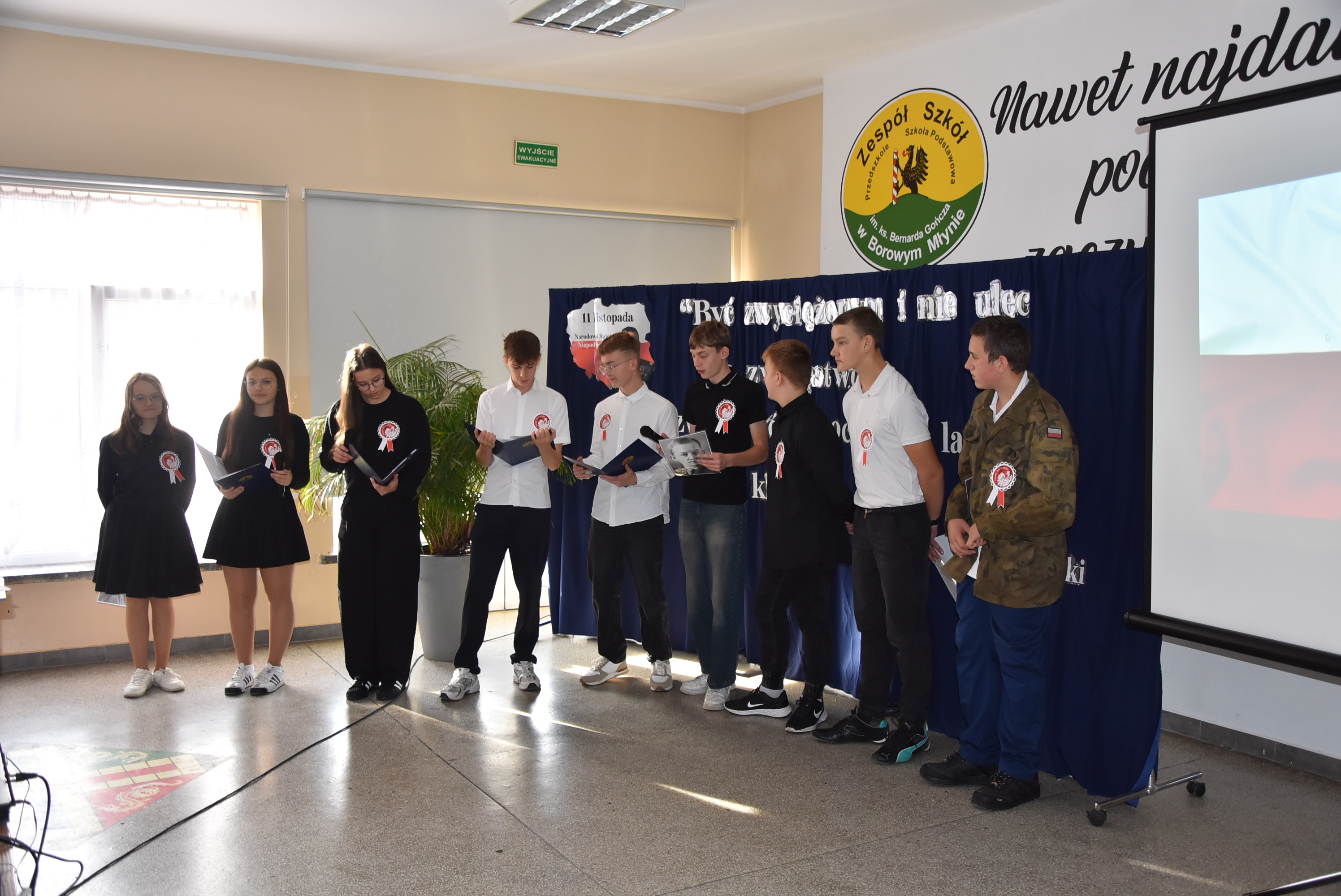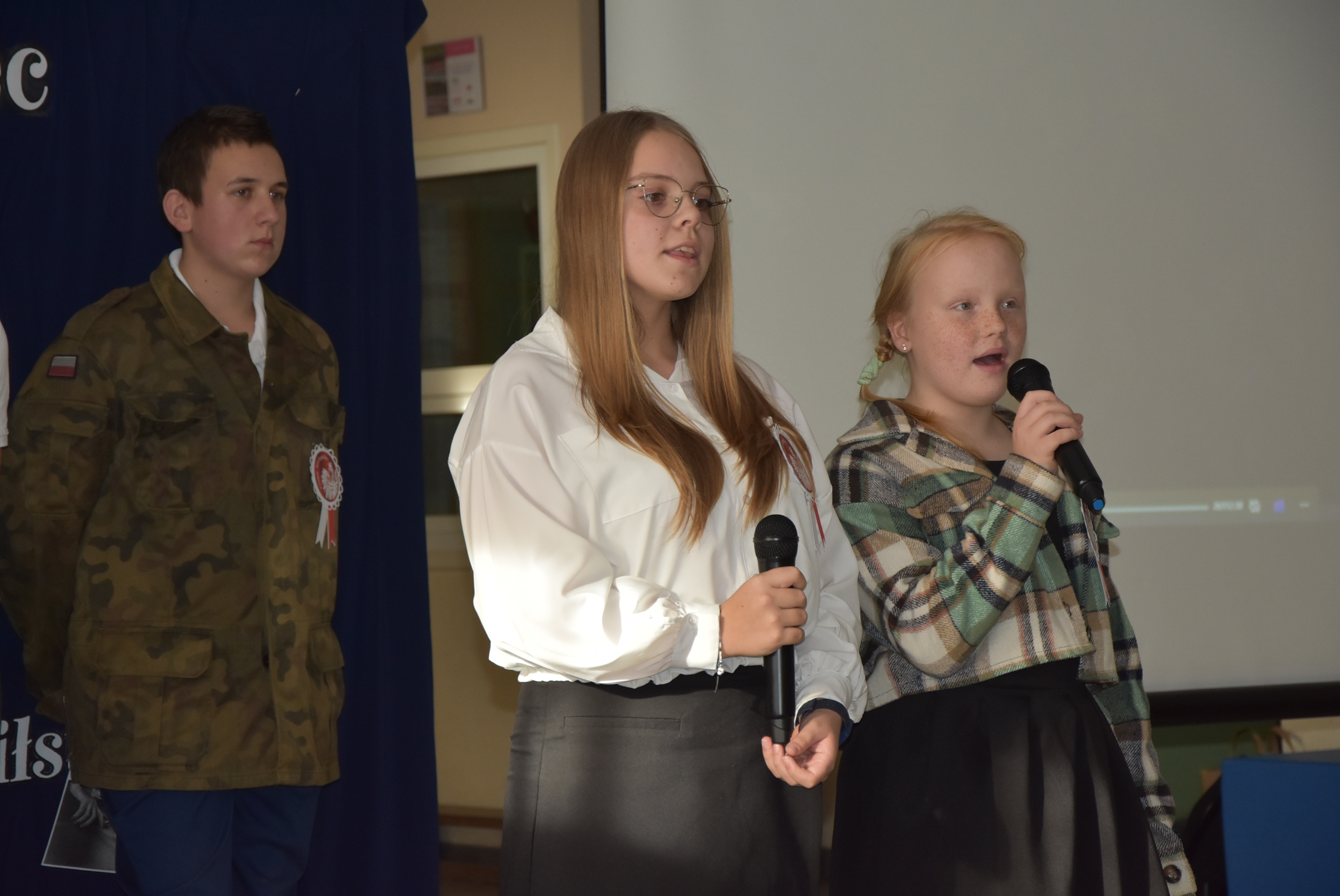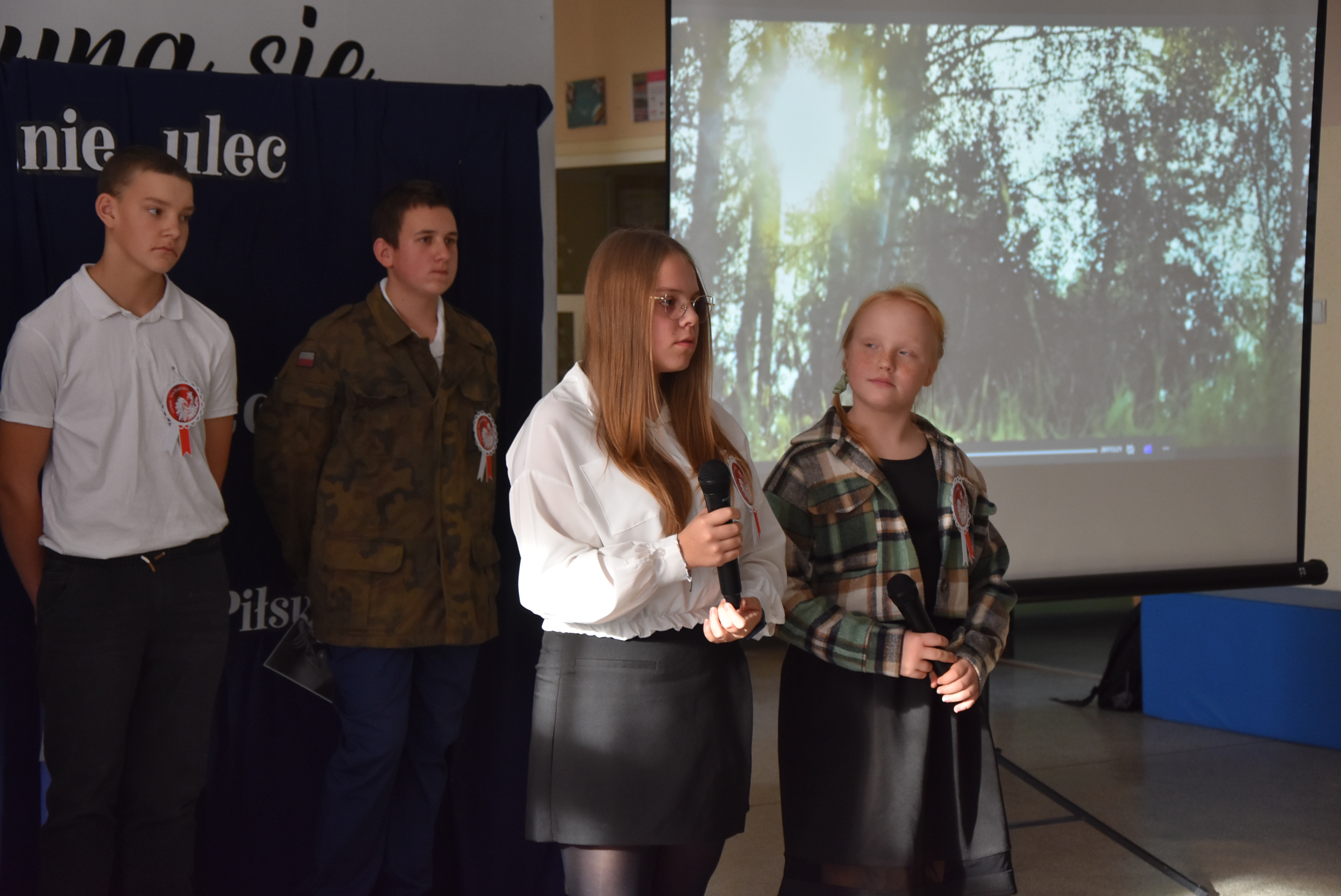 Uczniowie klasy ósmej, pod kierunkiem pani Iwony Krzoski, przygotowali montaż słowno–multimedialno–muzyczny, który wprowadził wszystkich w nastrój zadumy i wdzięczności wobec tych, którzy walczyli o wolność naszej ojczyzny.