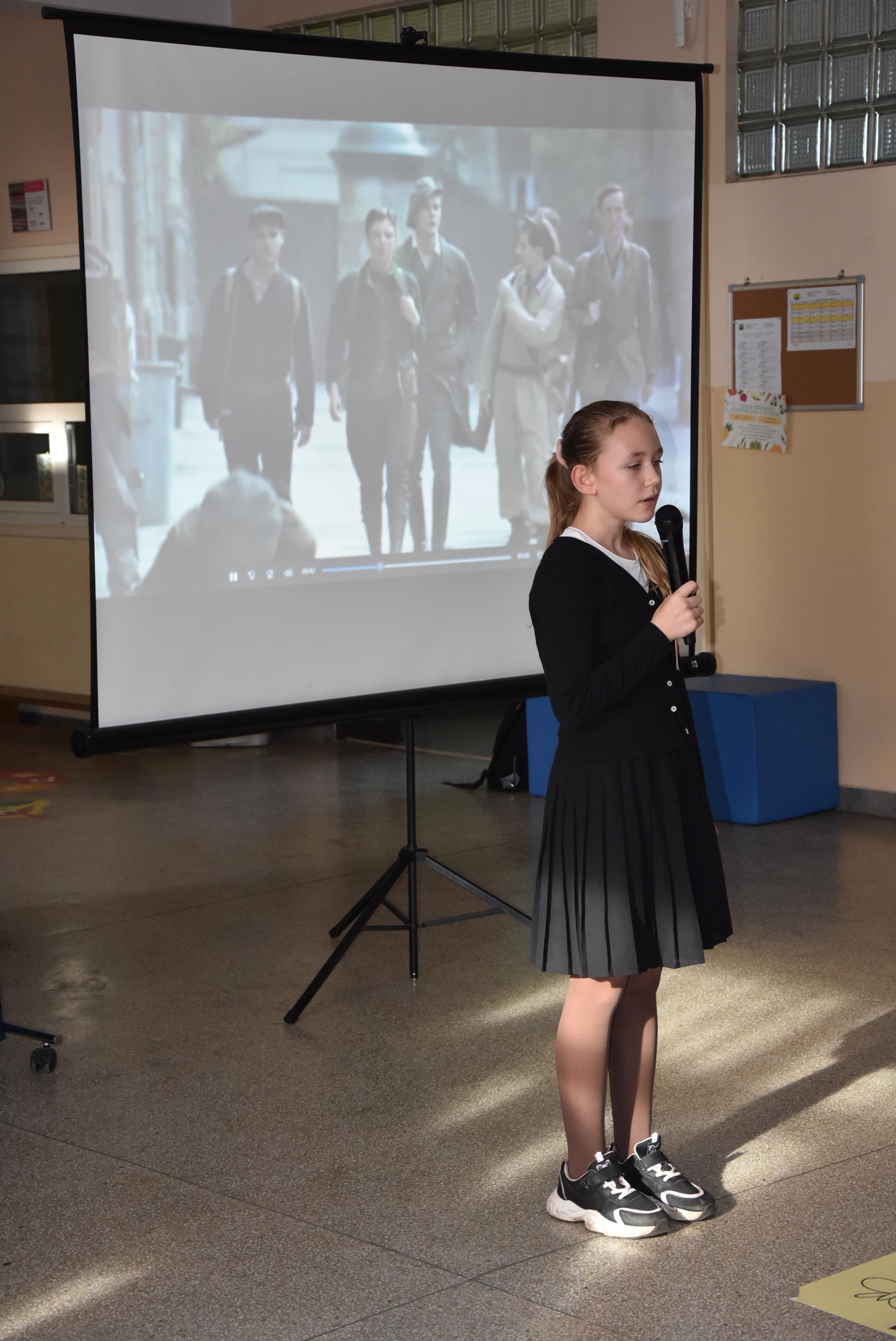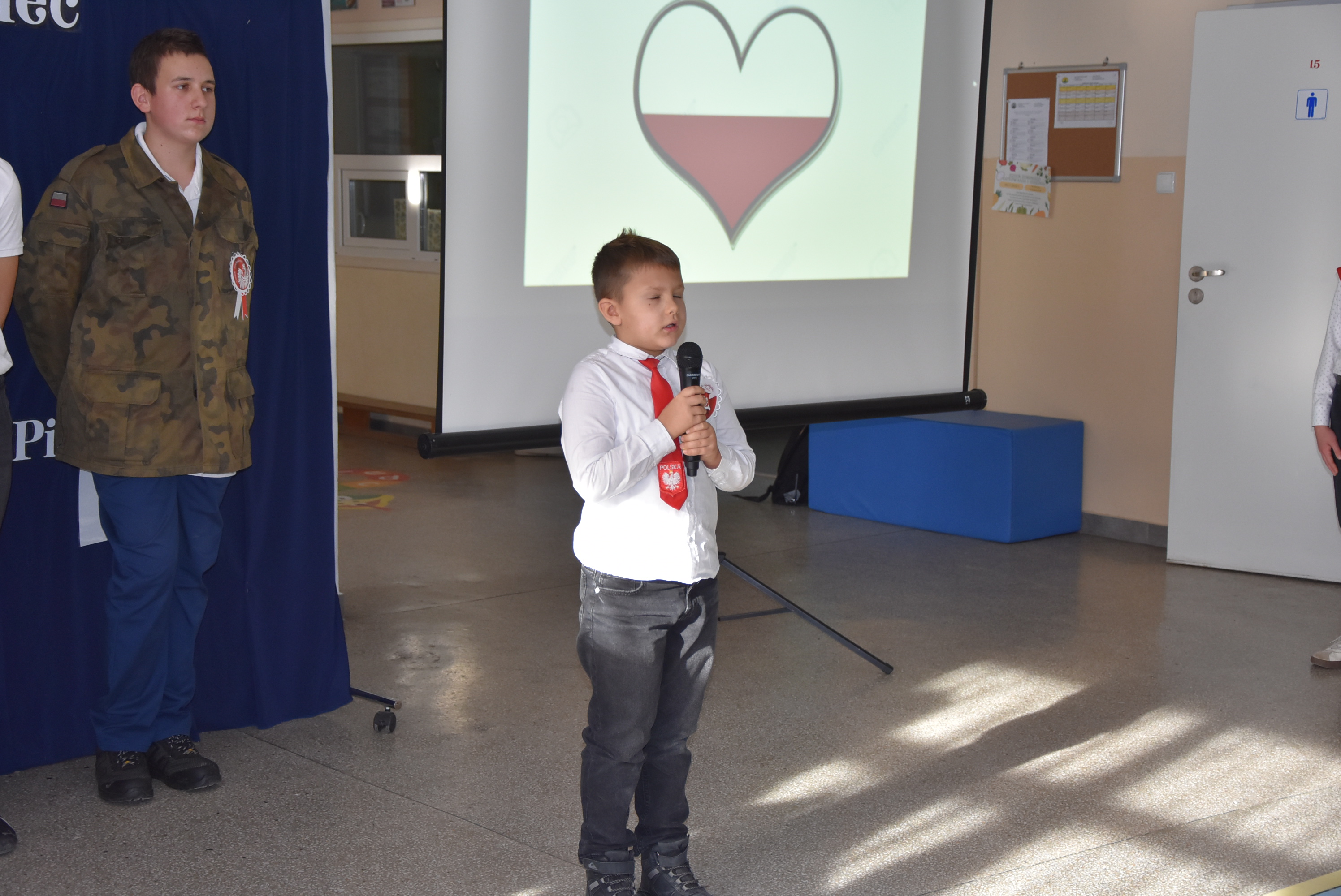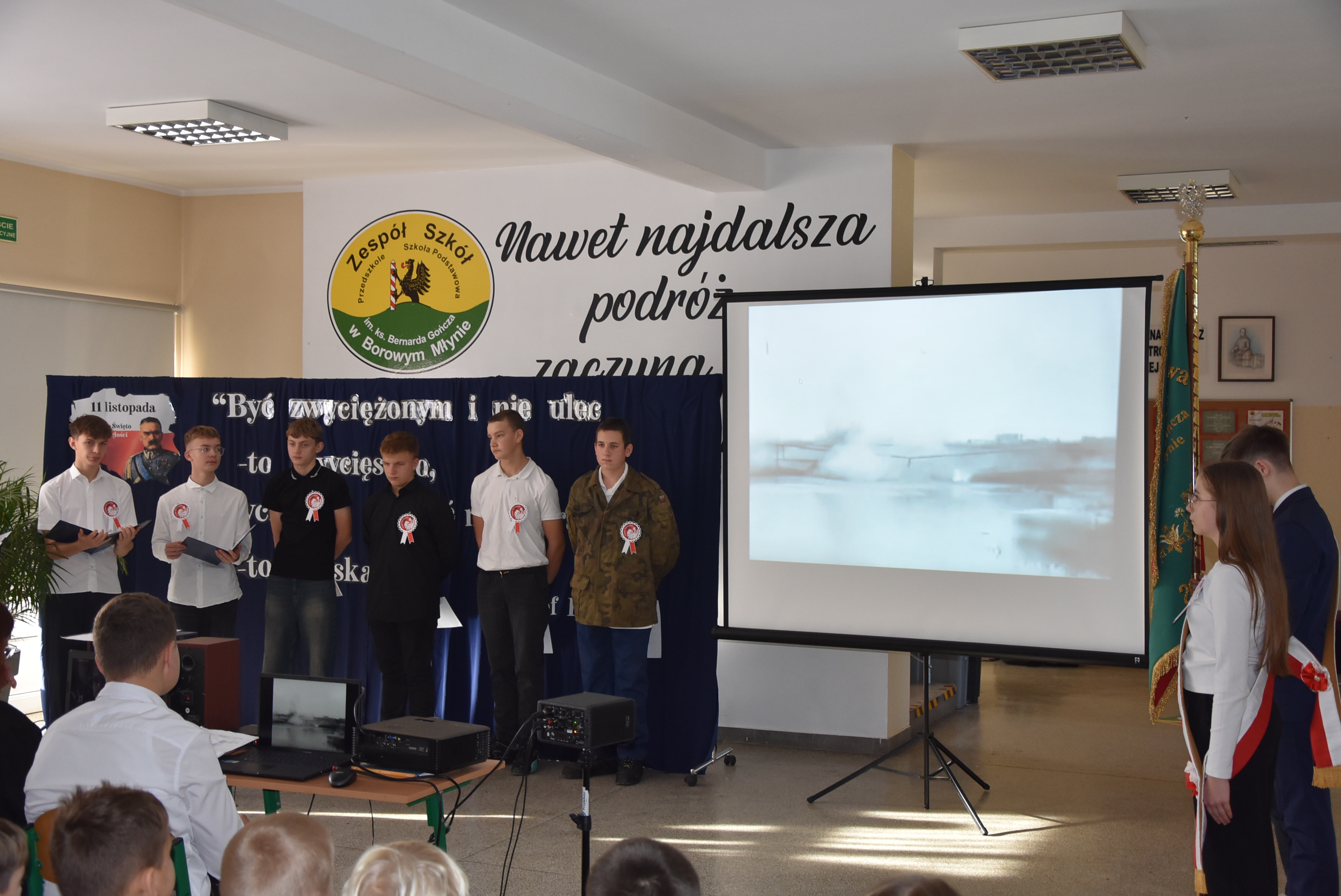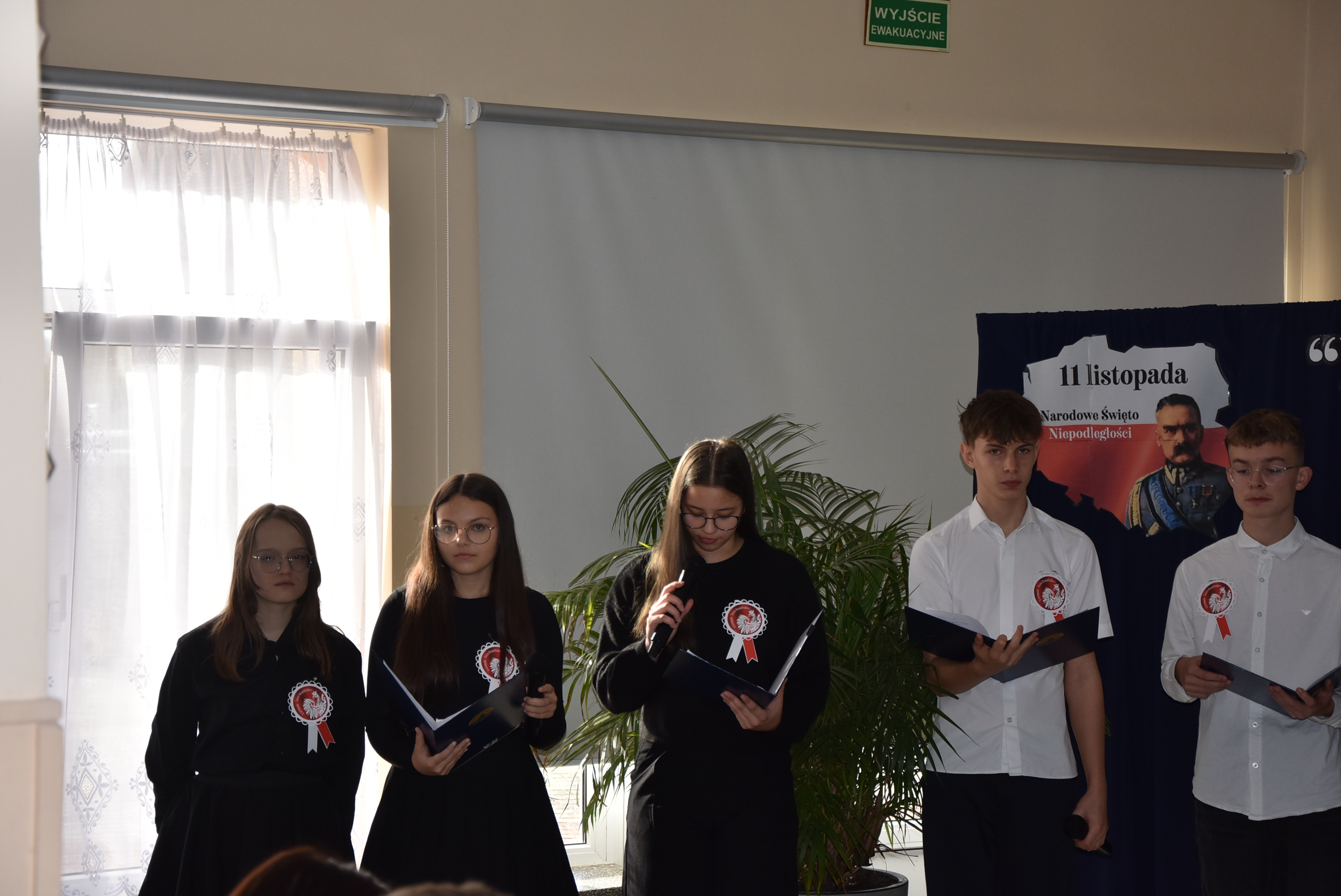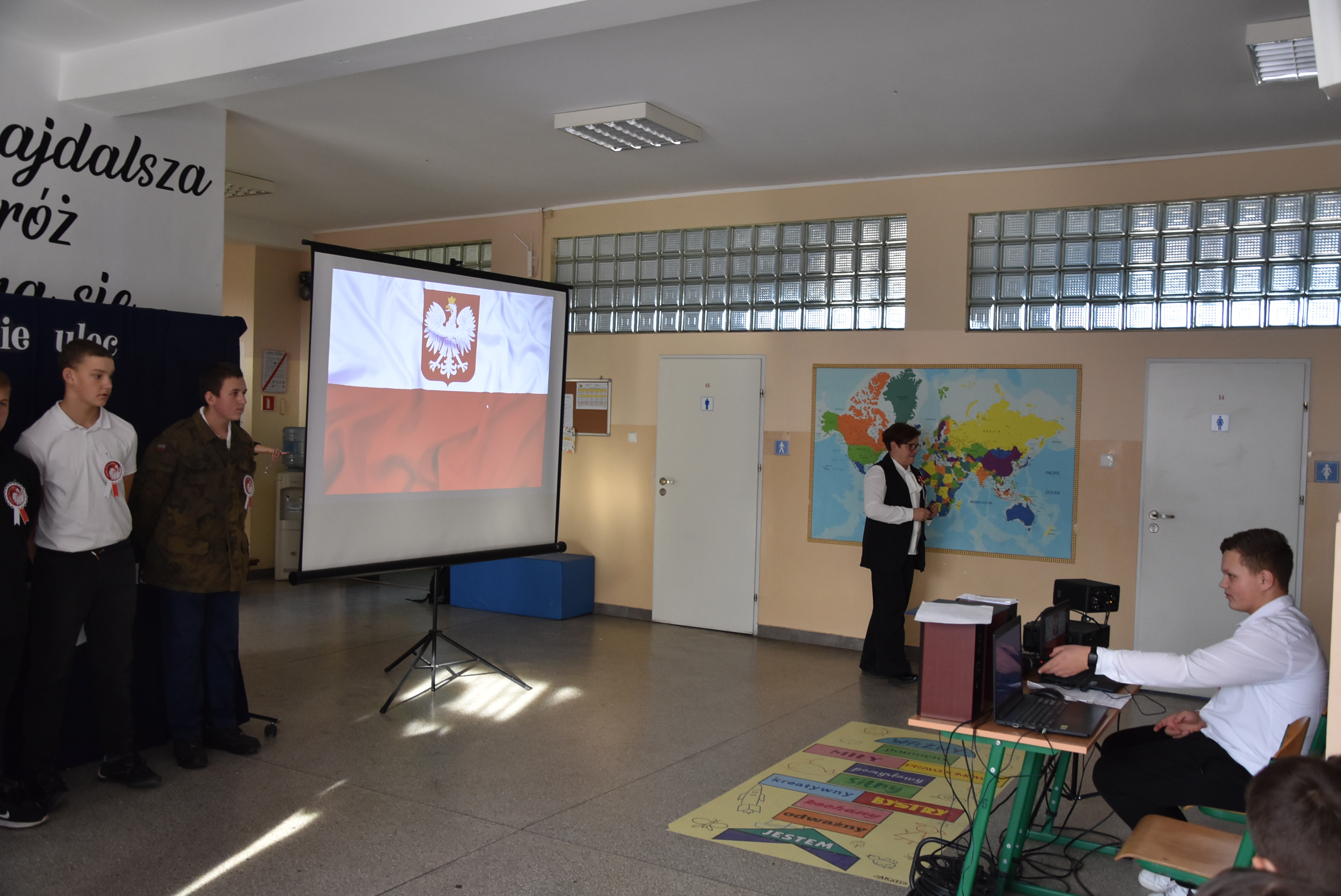 Uczniowie klasy ósmej, pod kierunkiem pani Iwony Krzoski, przygotowali montaż słowno–multimedialno–muzyczny, który wprowadził wszystkich w nastrój zadumy i wdzięczności wobec tych, którzy walczyli o wolność naszej ojczyzny.