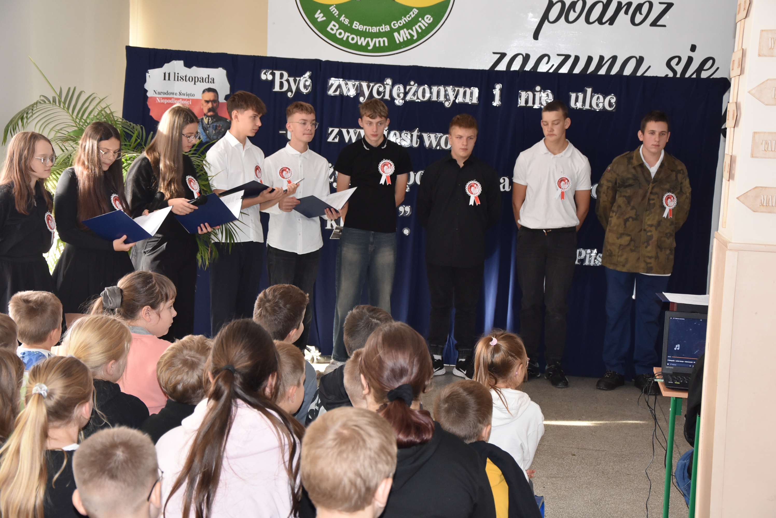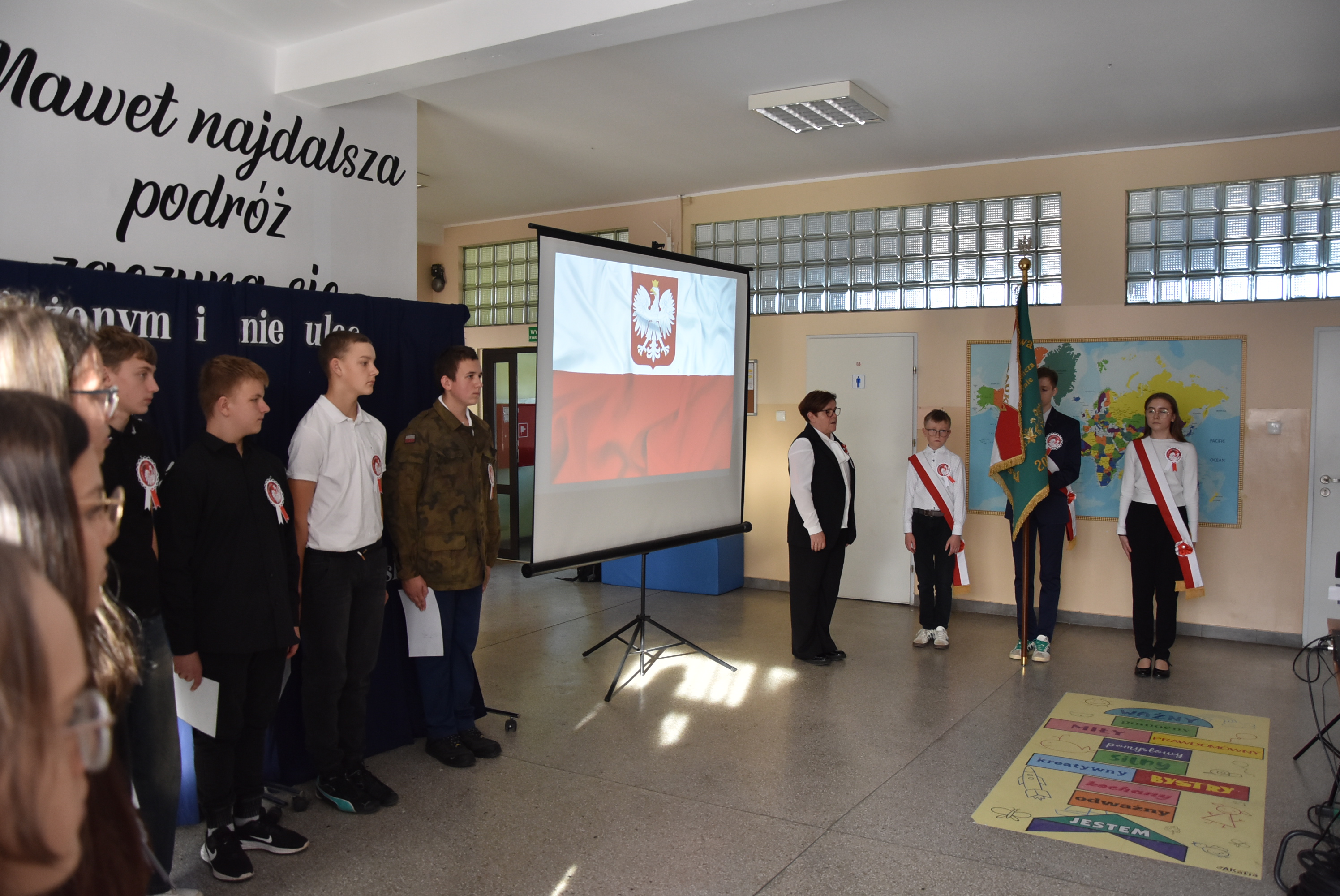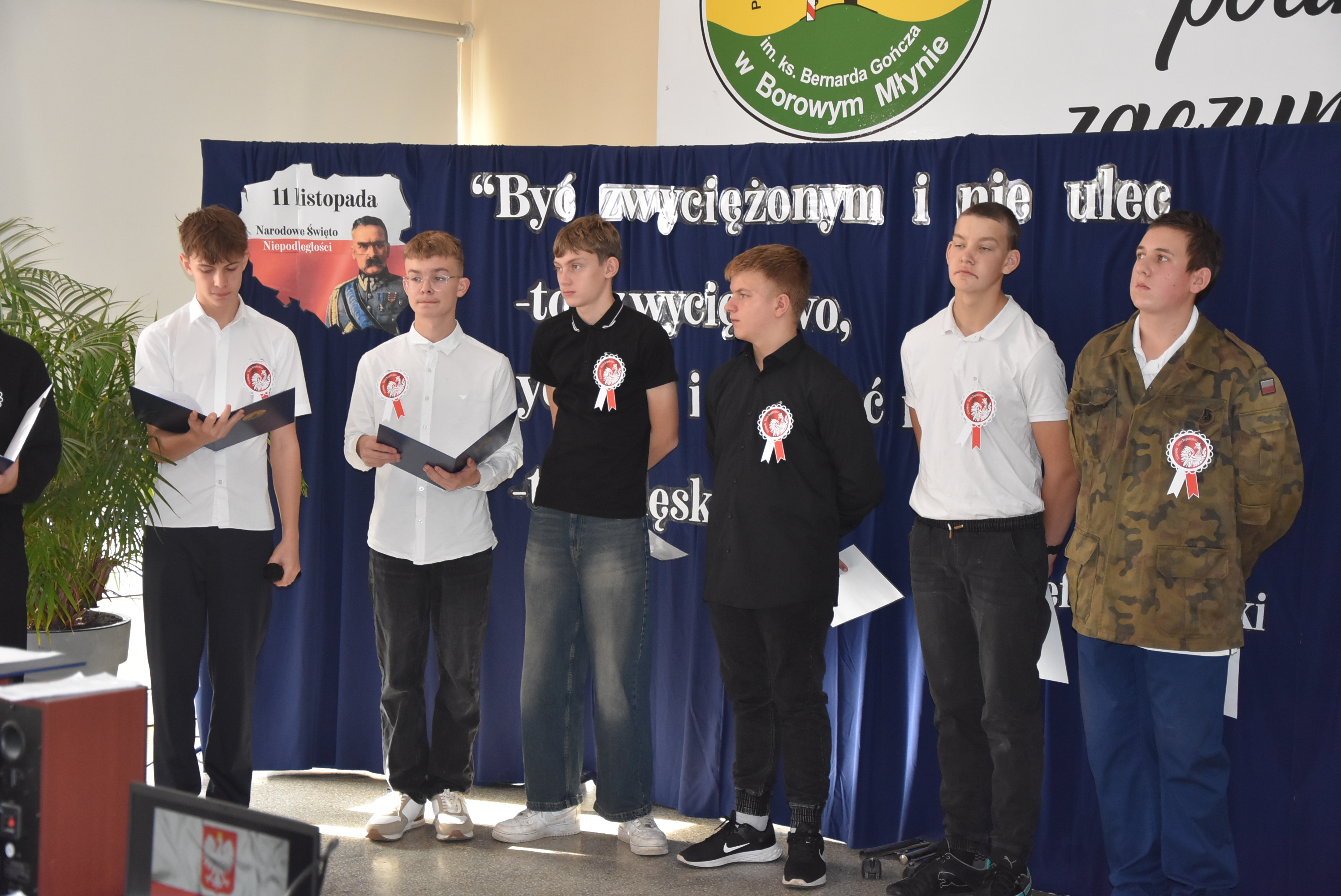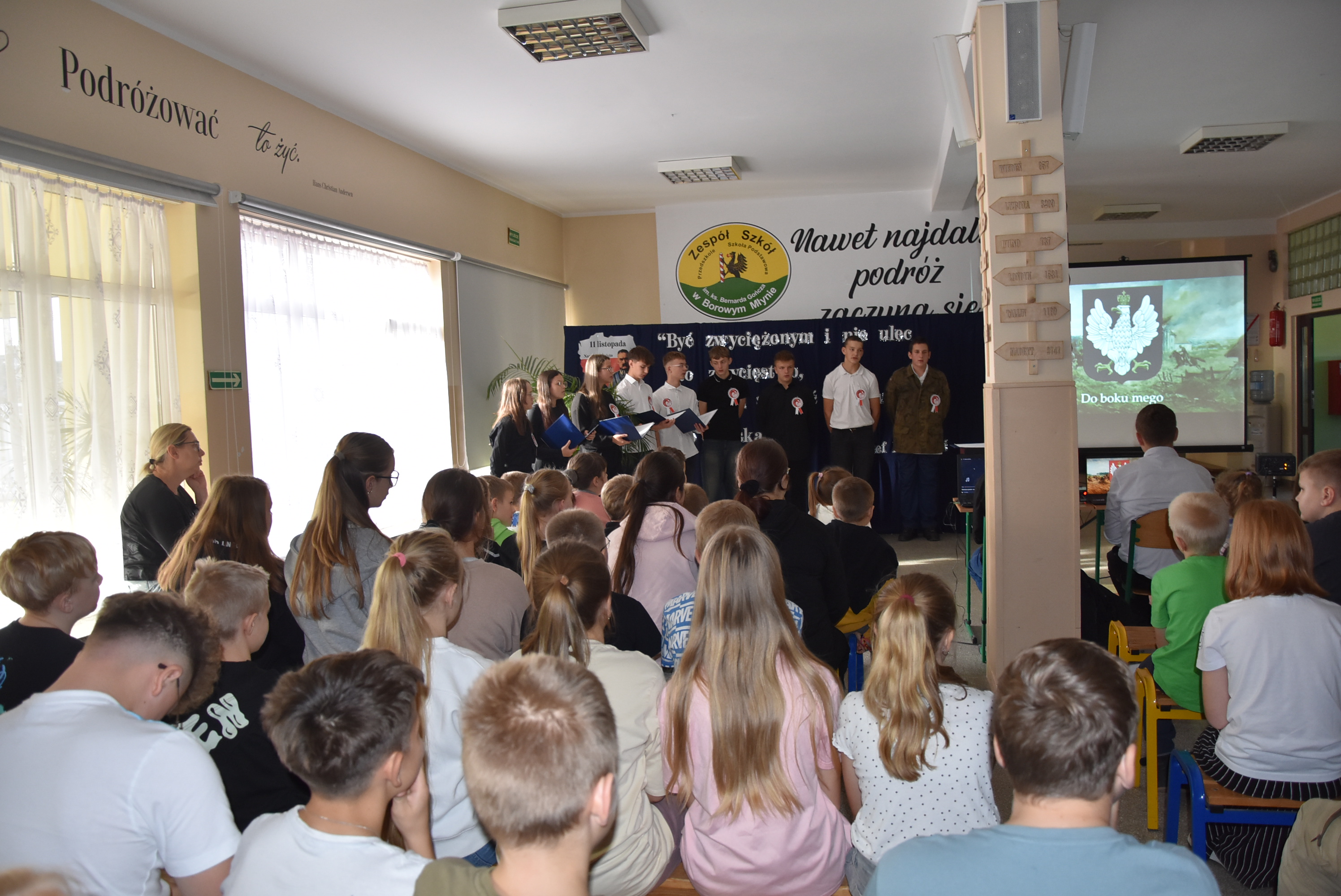 Podczas apelu wystąpili również laureaci szkolnego konkursu piosenki patriotycznej, wzbogacając obchody swoim talentem i zaangażowaniem.