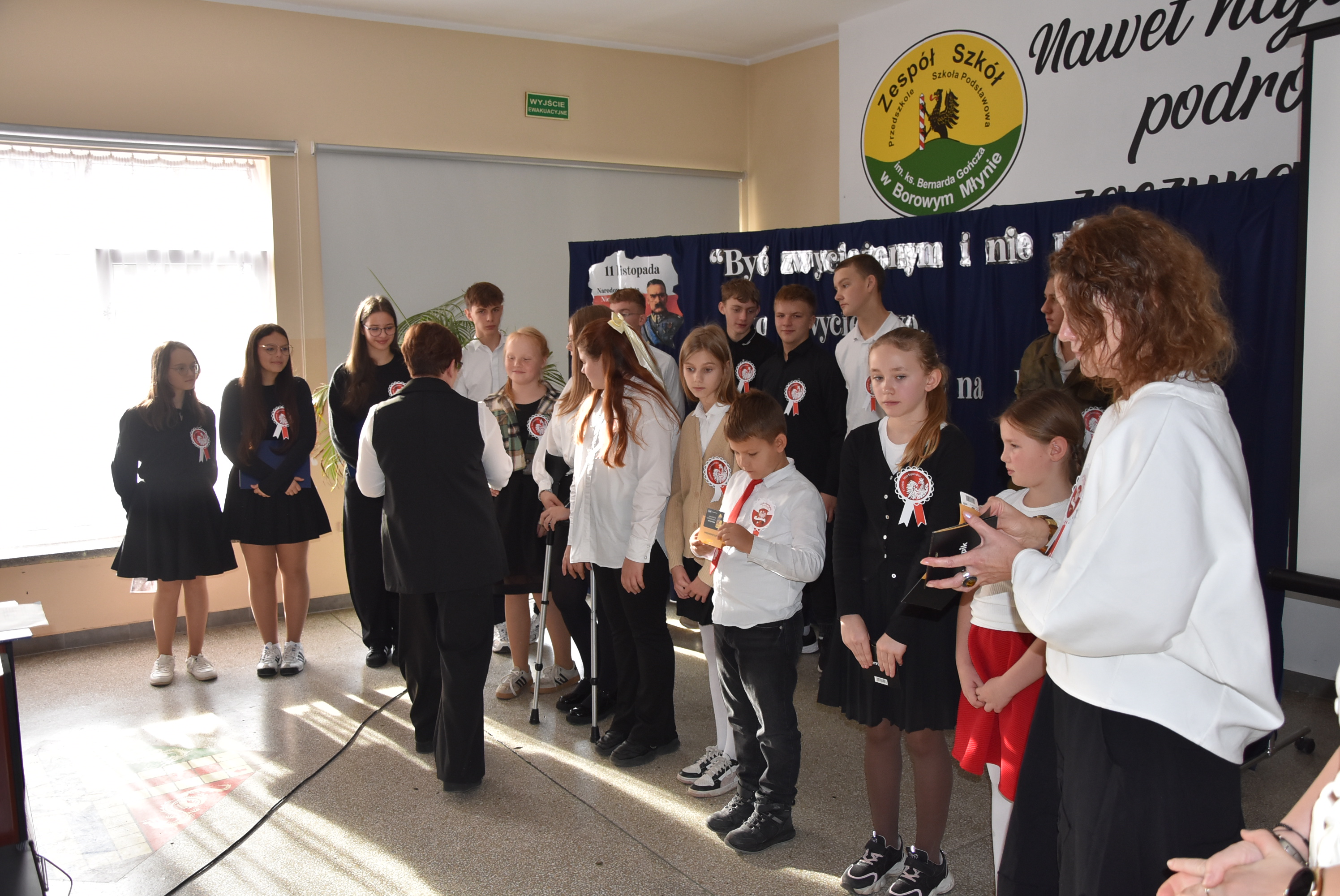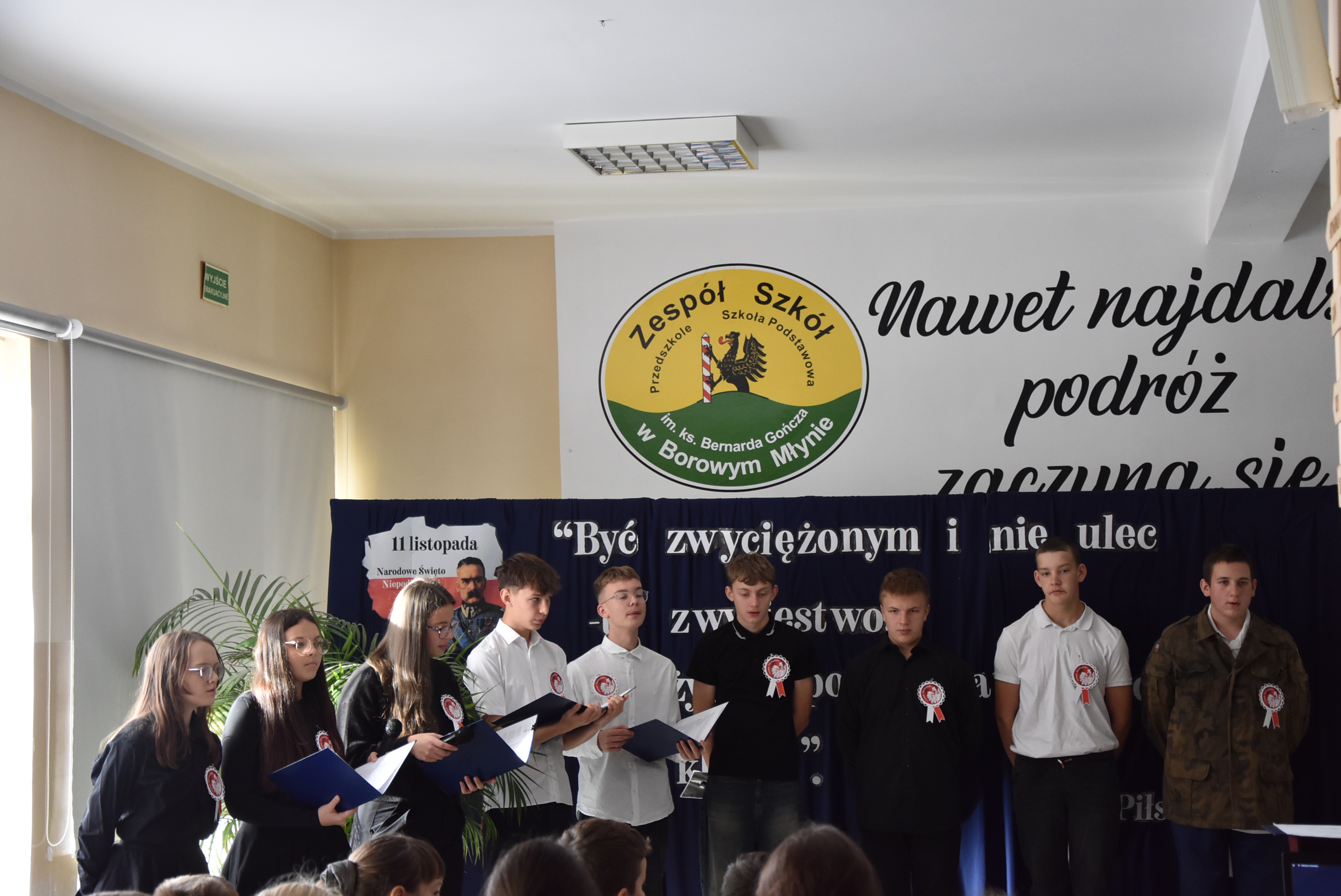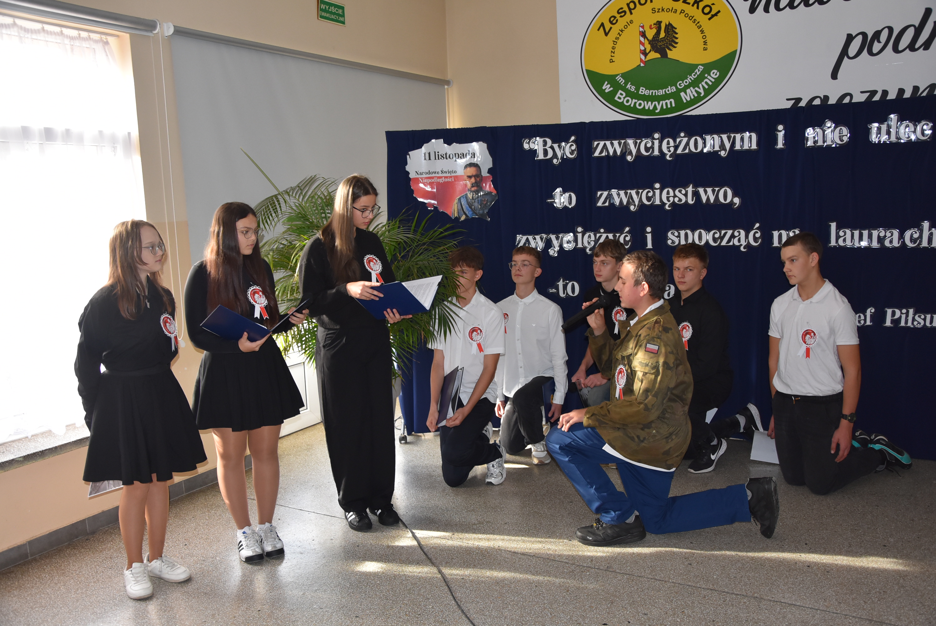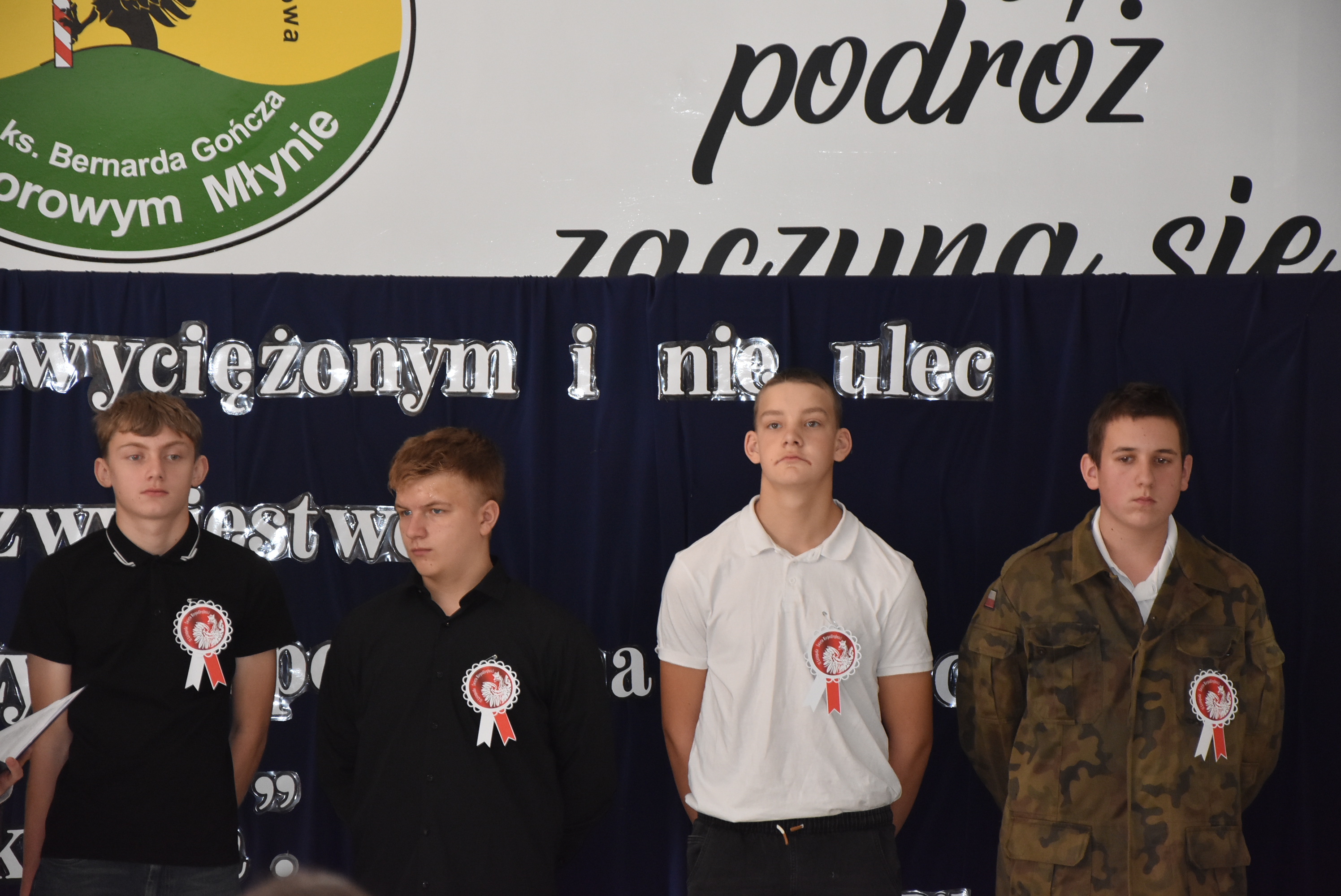 Podczas apelu wystąpili również laureaci szkolnego konkursu piosenki patriotycznej, wzbogacając obchody swoim talentem i zaangażowaniem.