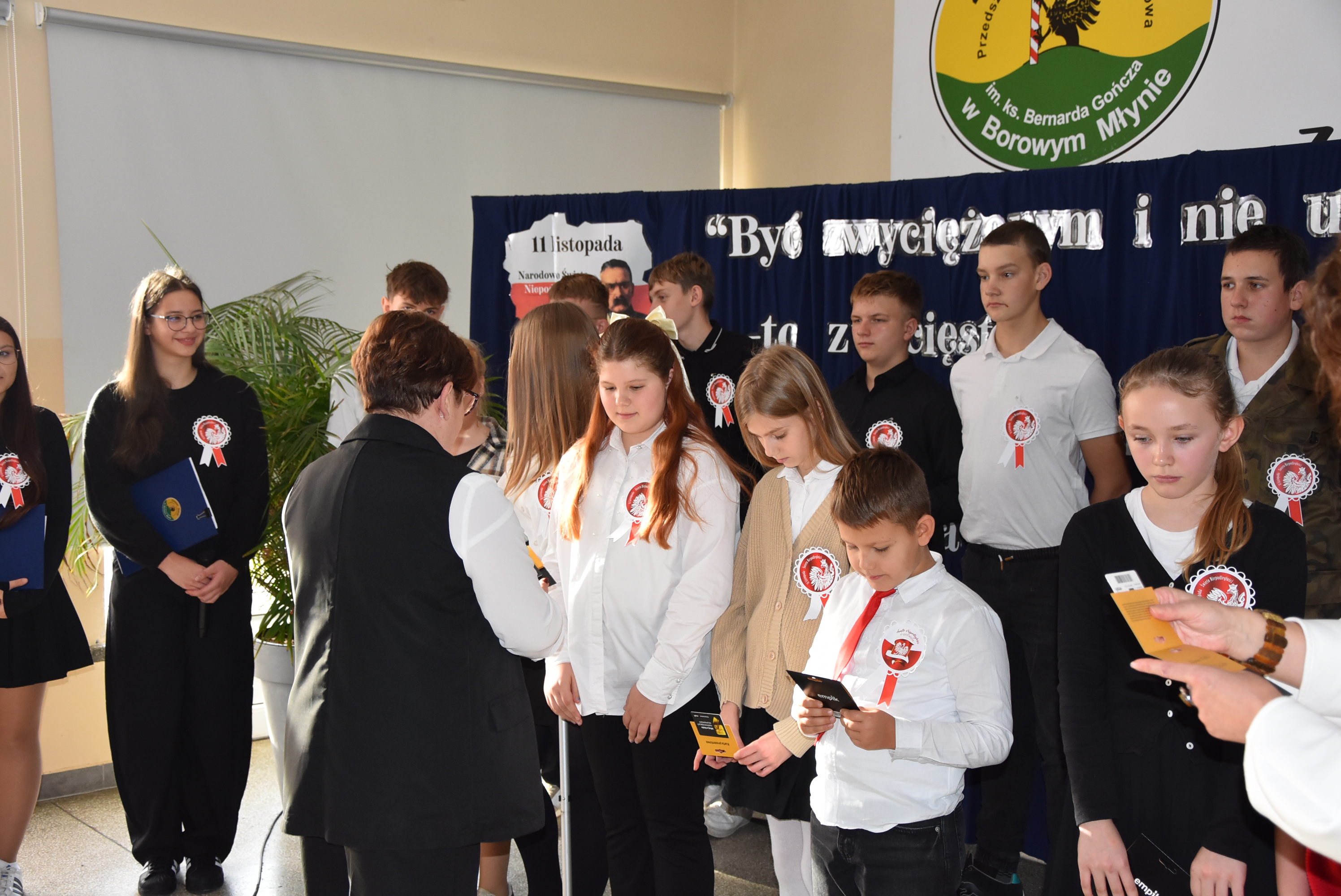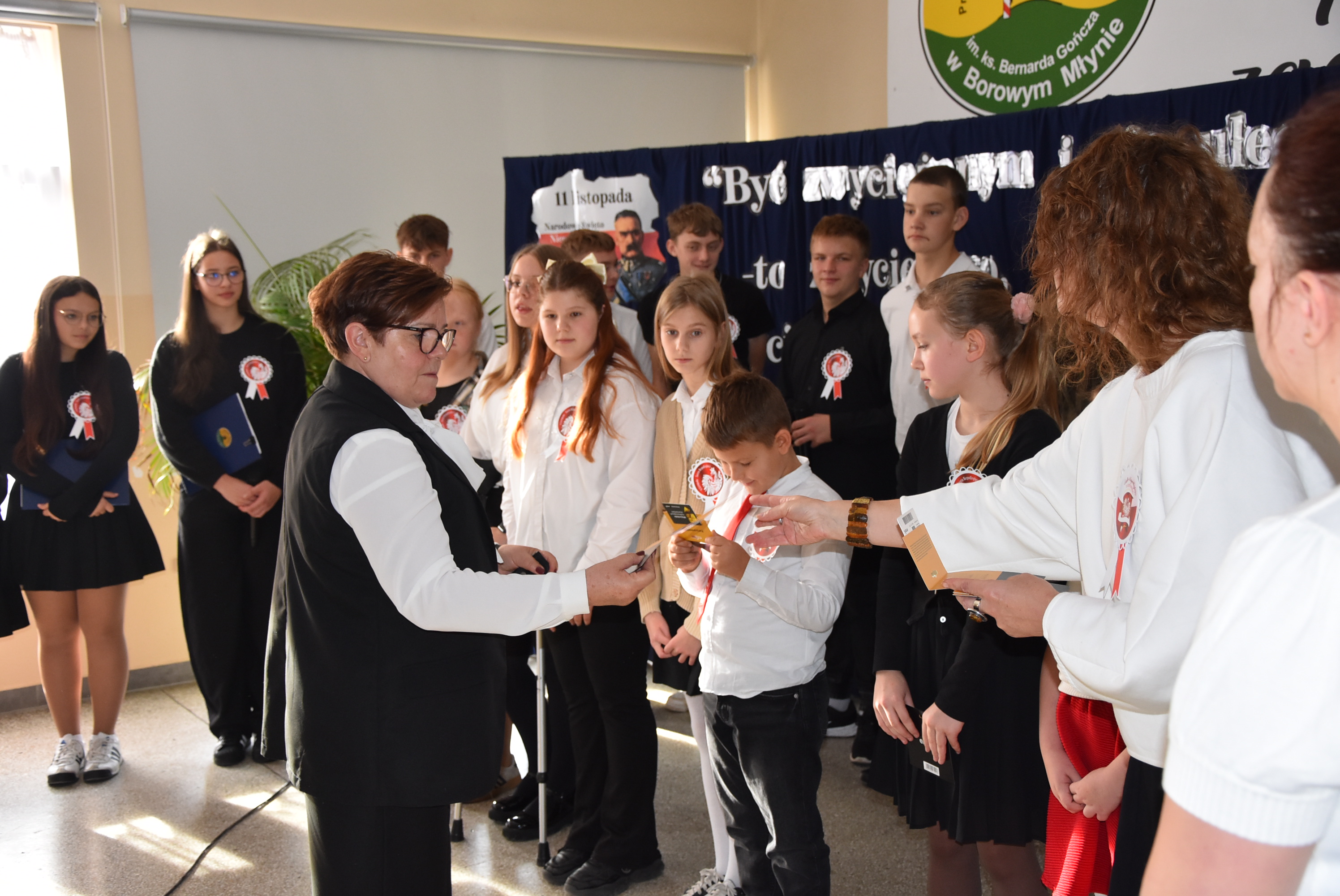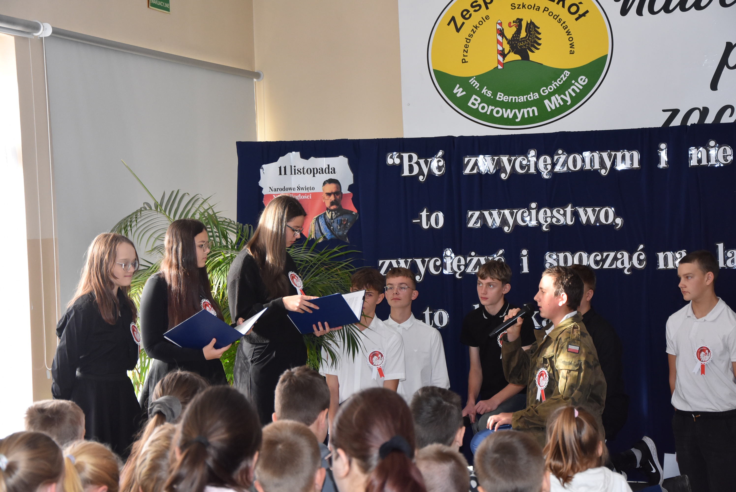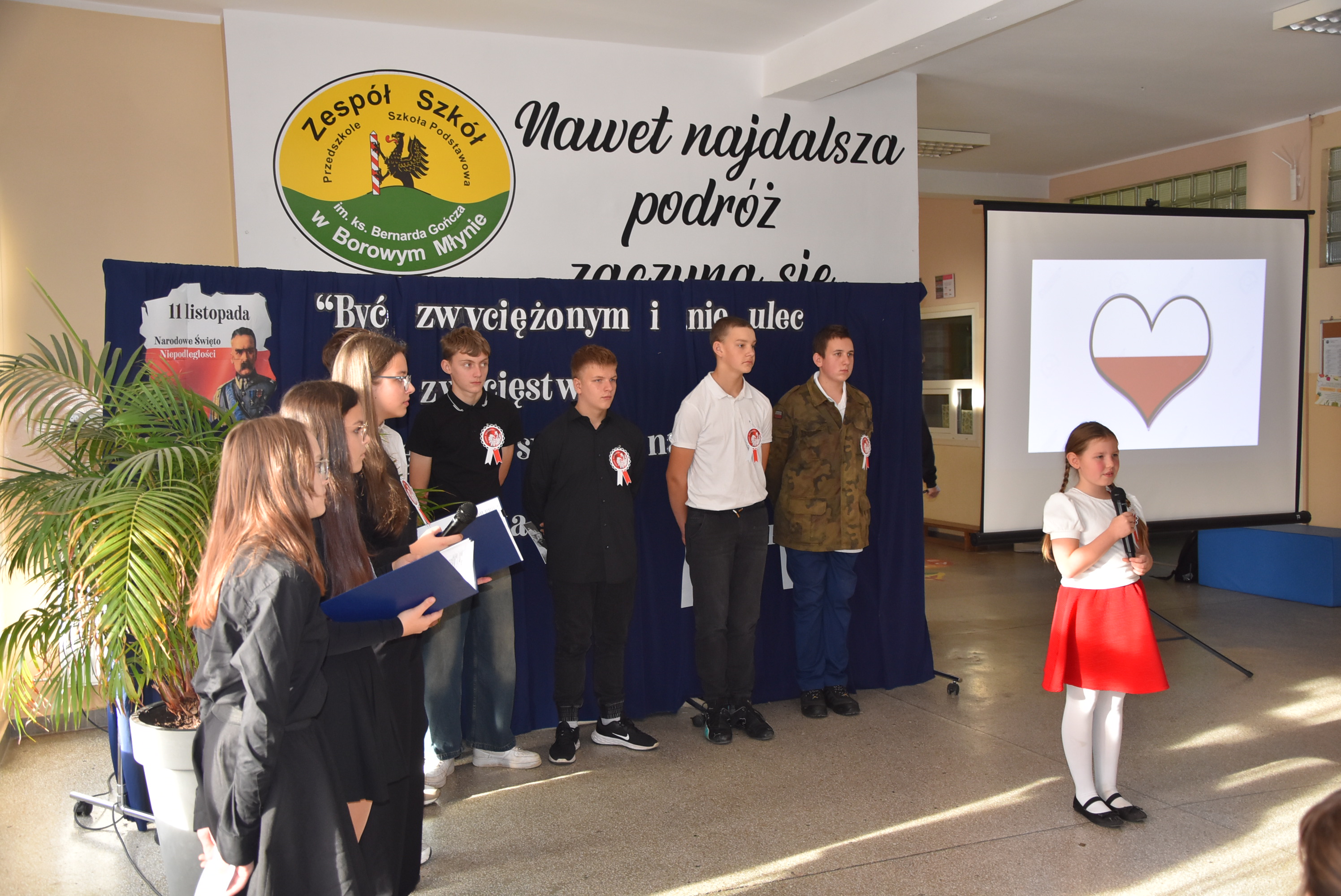 Podczas apelu wystąpili również laureaci szkolnego konkursu piosenki patriotycznej, wzbogacając obchody swoim talentem i zaangażowaniem.