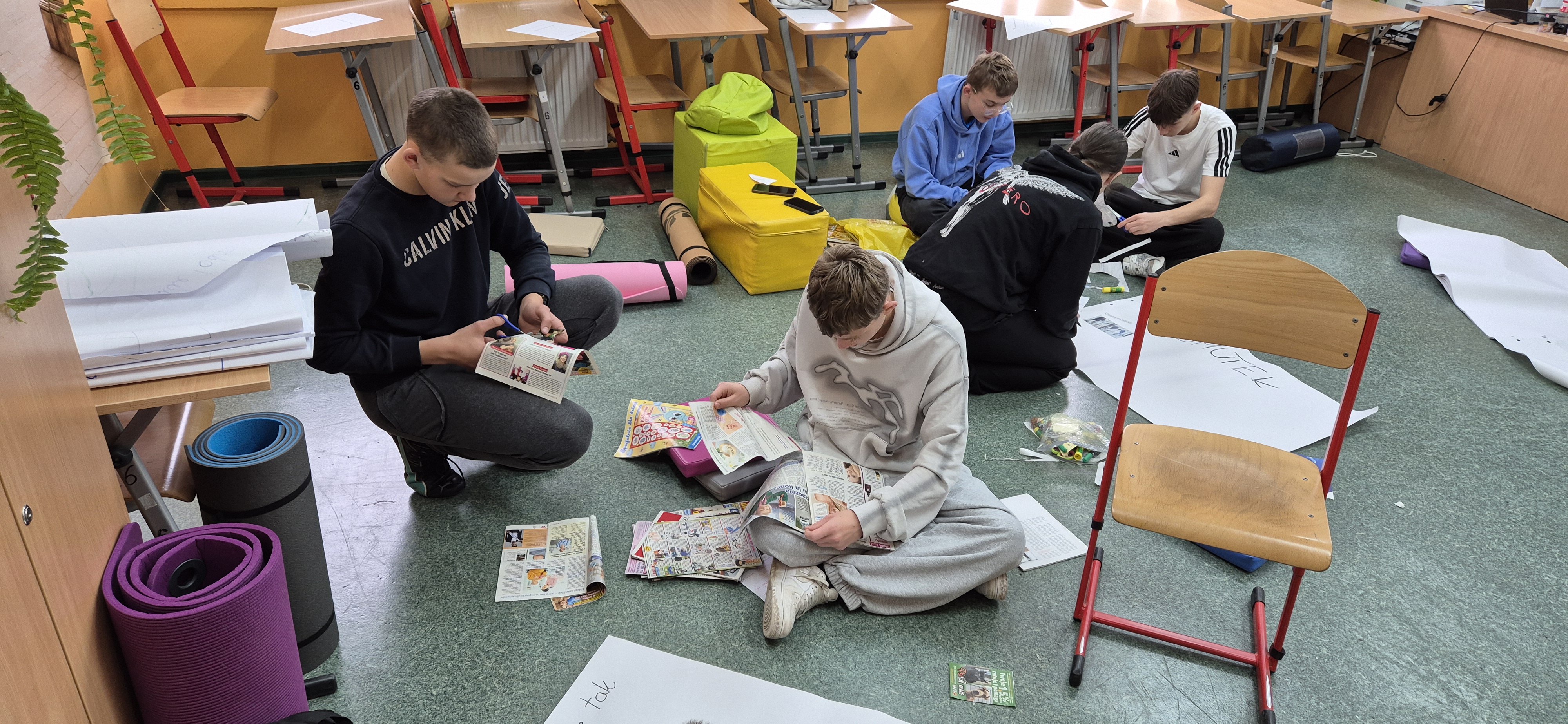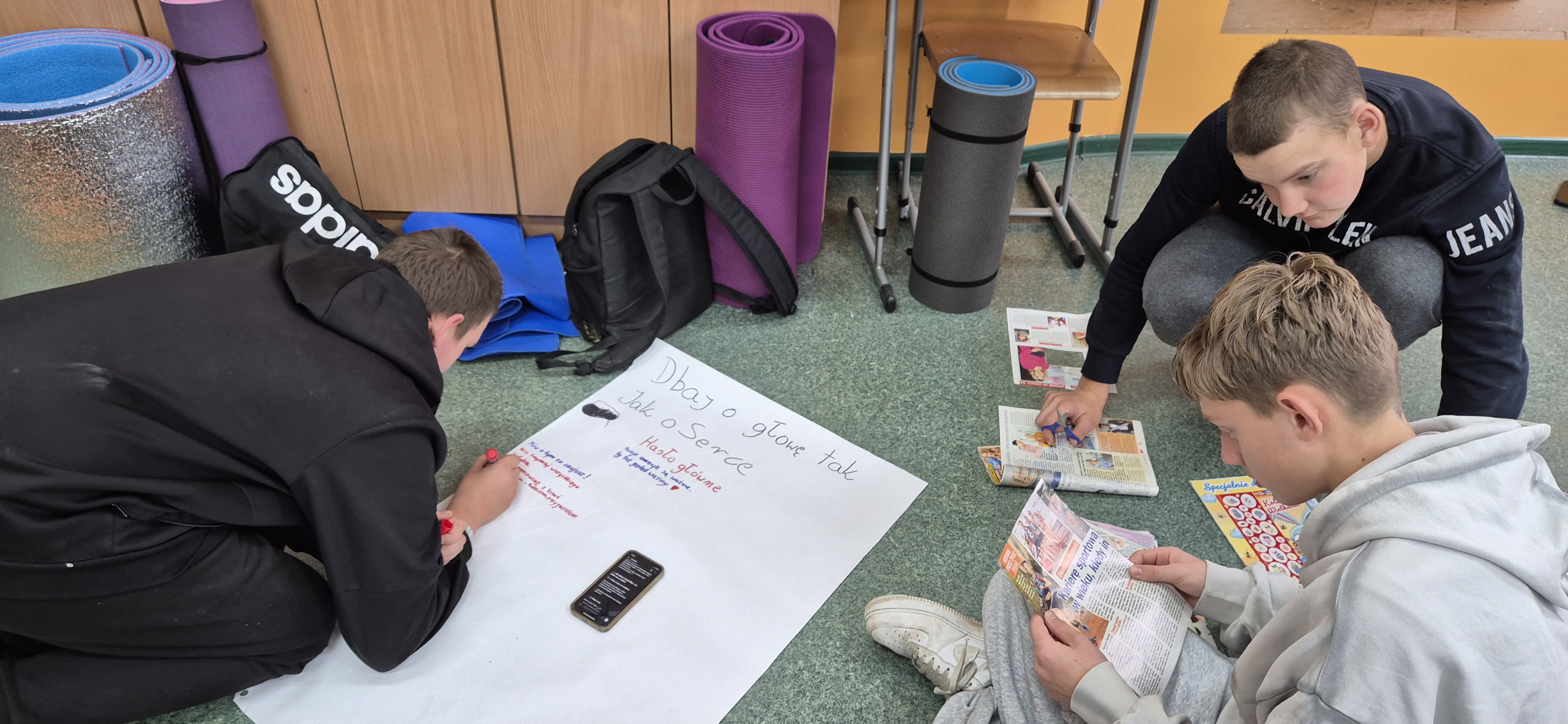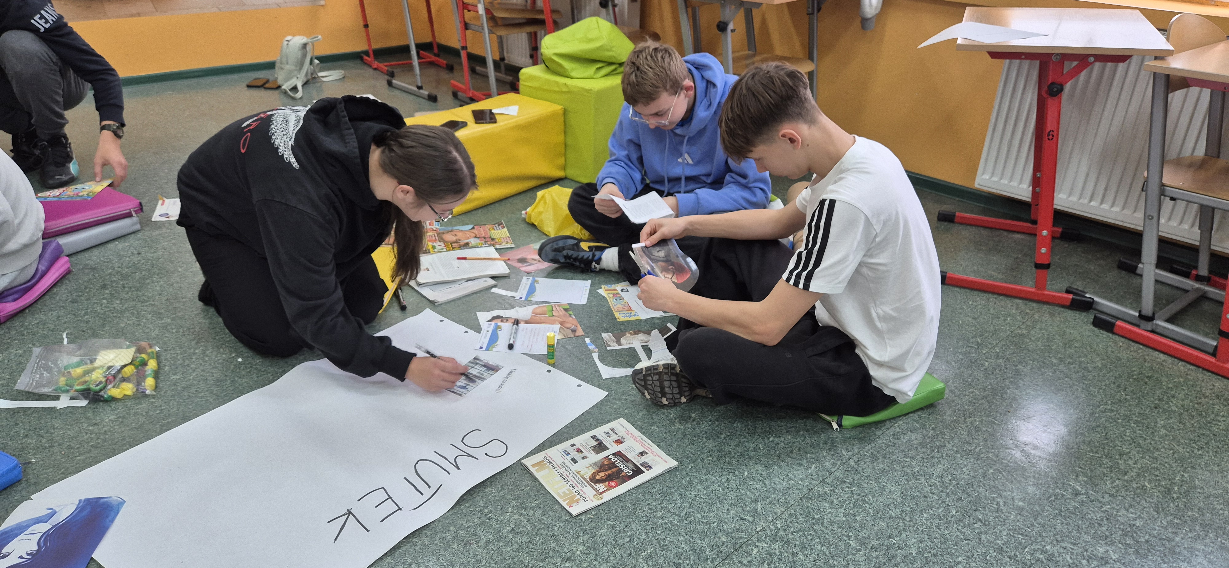 Młodzież wraz z panią Agnieszką Wantoch Rekowską przygotowywała plakaty profilaktyczne, ale też trenowała techniki rozładowywania stresu i negatywnych uczuć.