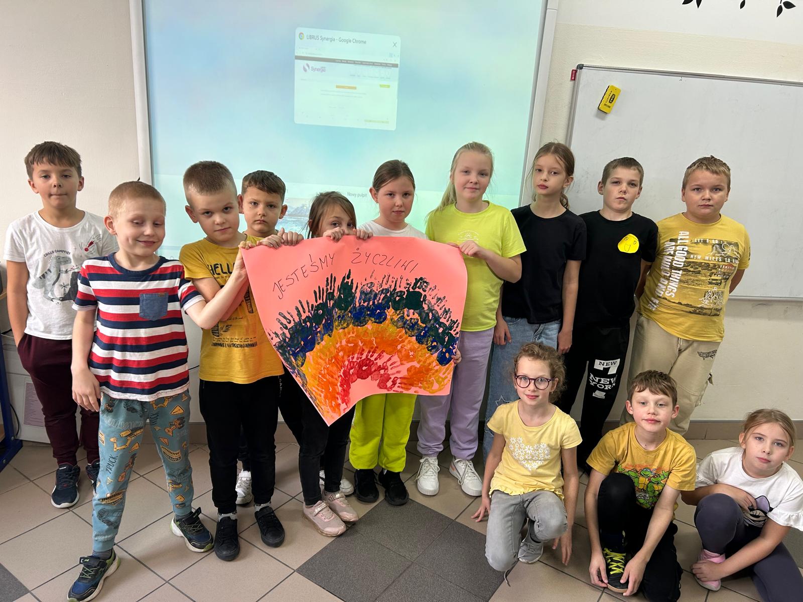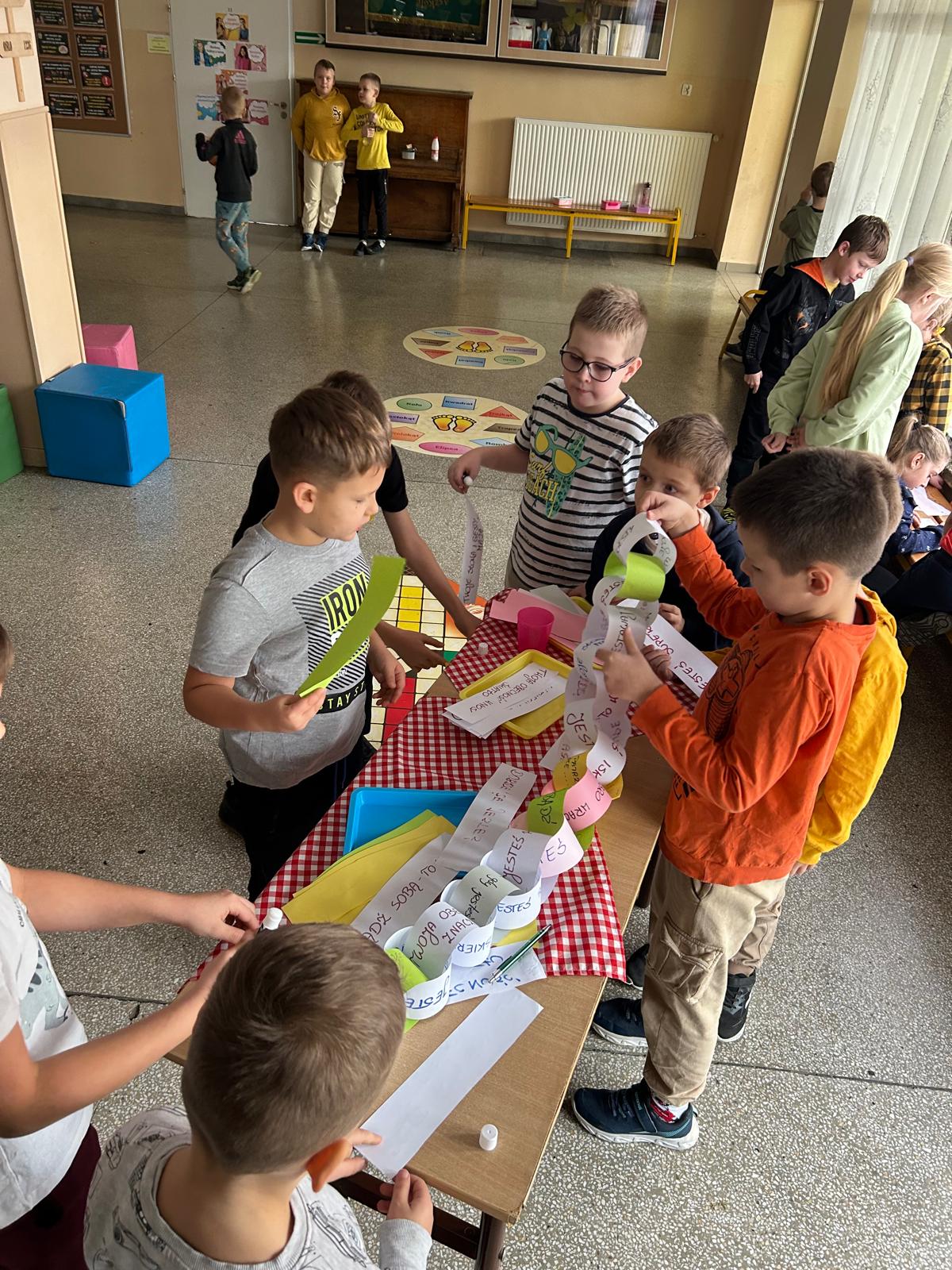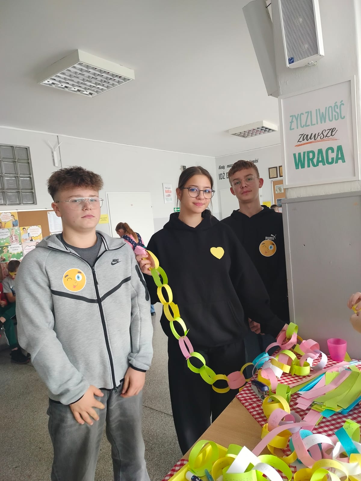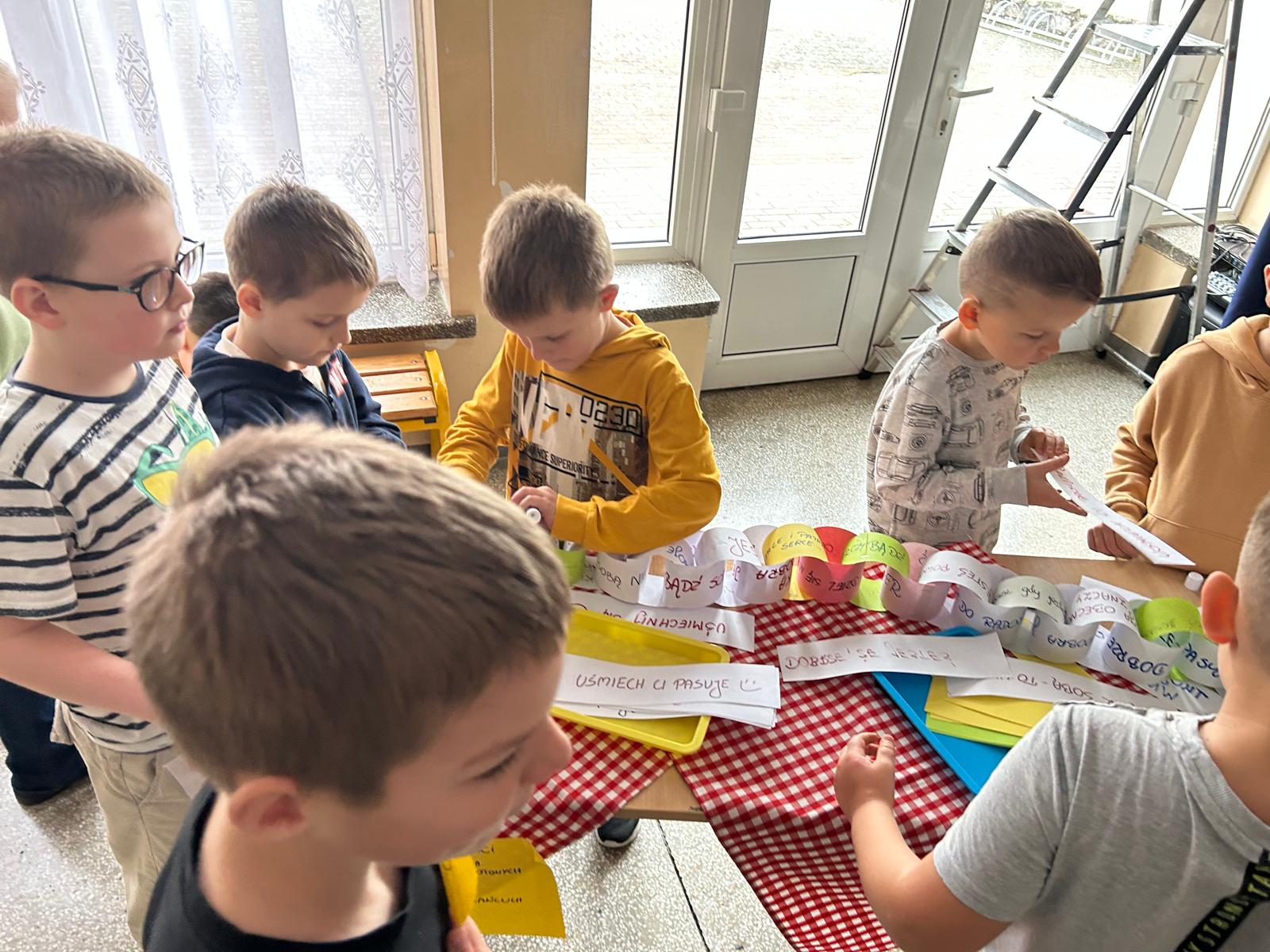 Dzisiaj przedszkolaki i uczniowie wspólnie świętowali Dzień Życzliwości i Pozdrowień. Był to czas pełen uśmiechów, dobrych słów i wspólnej zabawy. Dzieci brały udział w aktywnościach promujących życzliwość, tworzyły drzewa oraz tęcze życzliwości, a także przygotowały łańcuch życzliwości, który symbolicznie połączył nas wszystkich.
