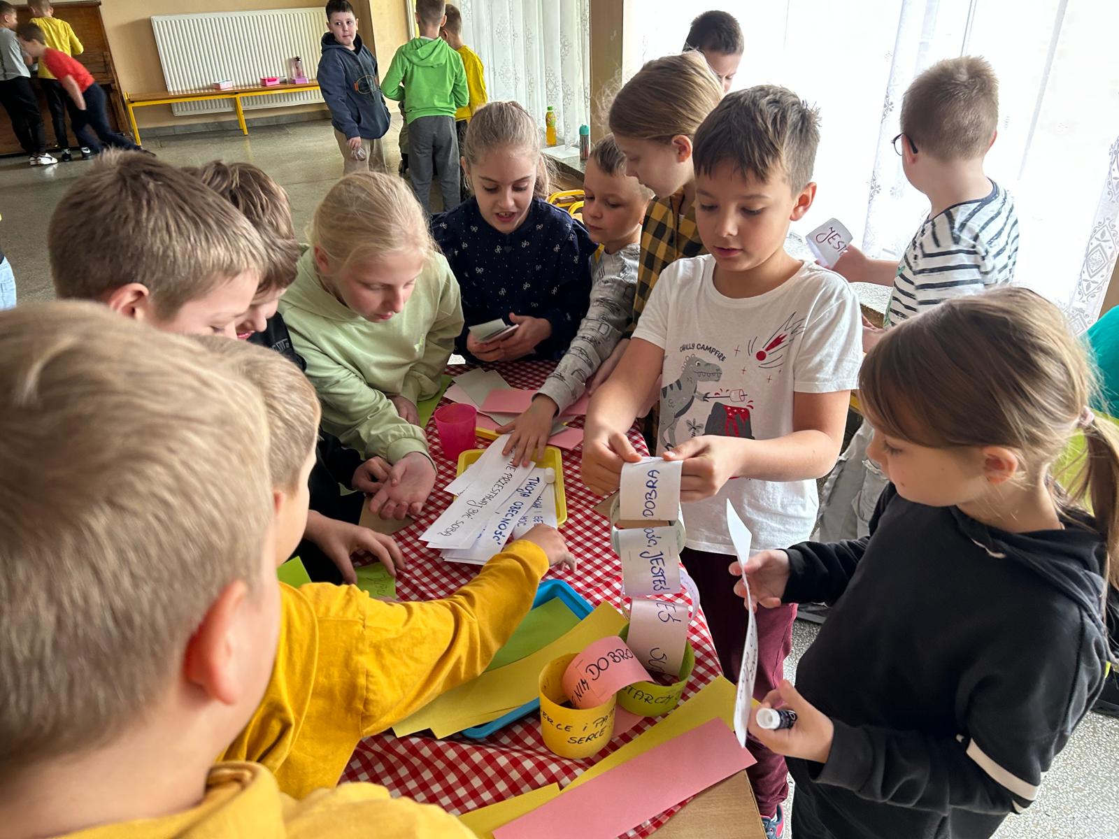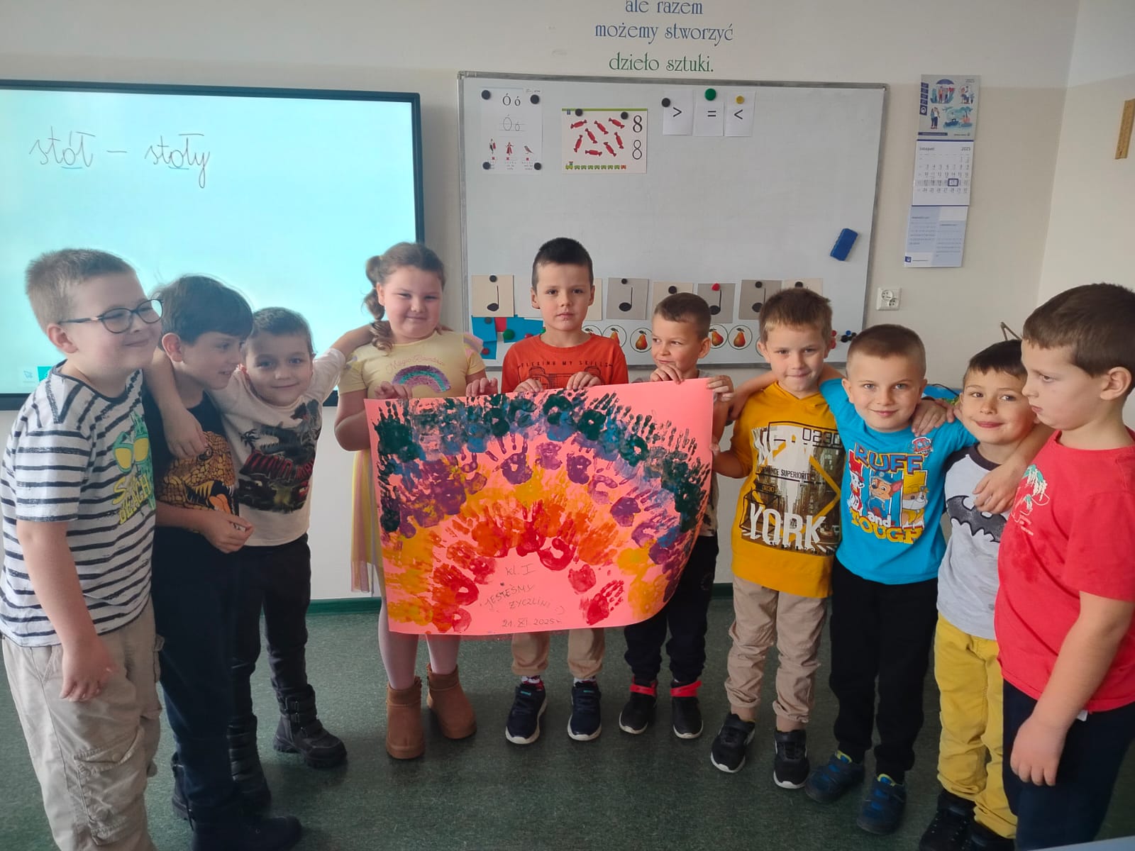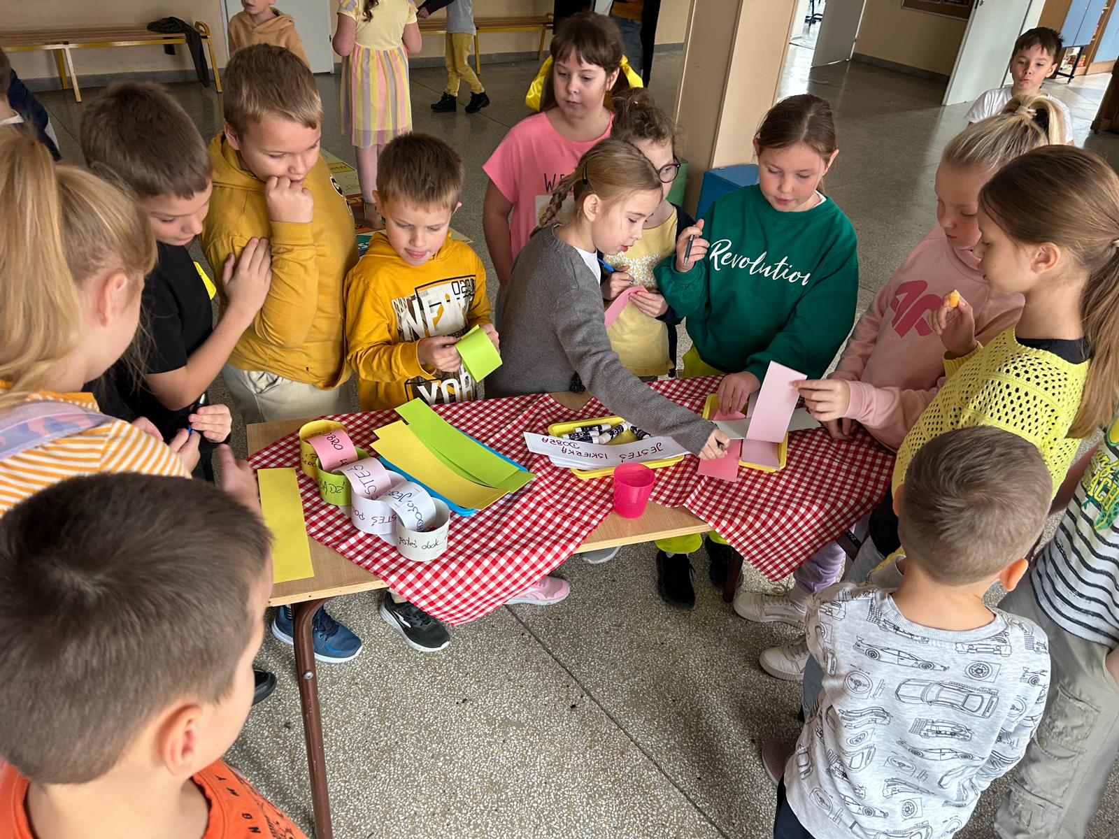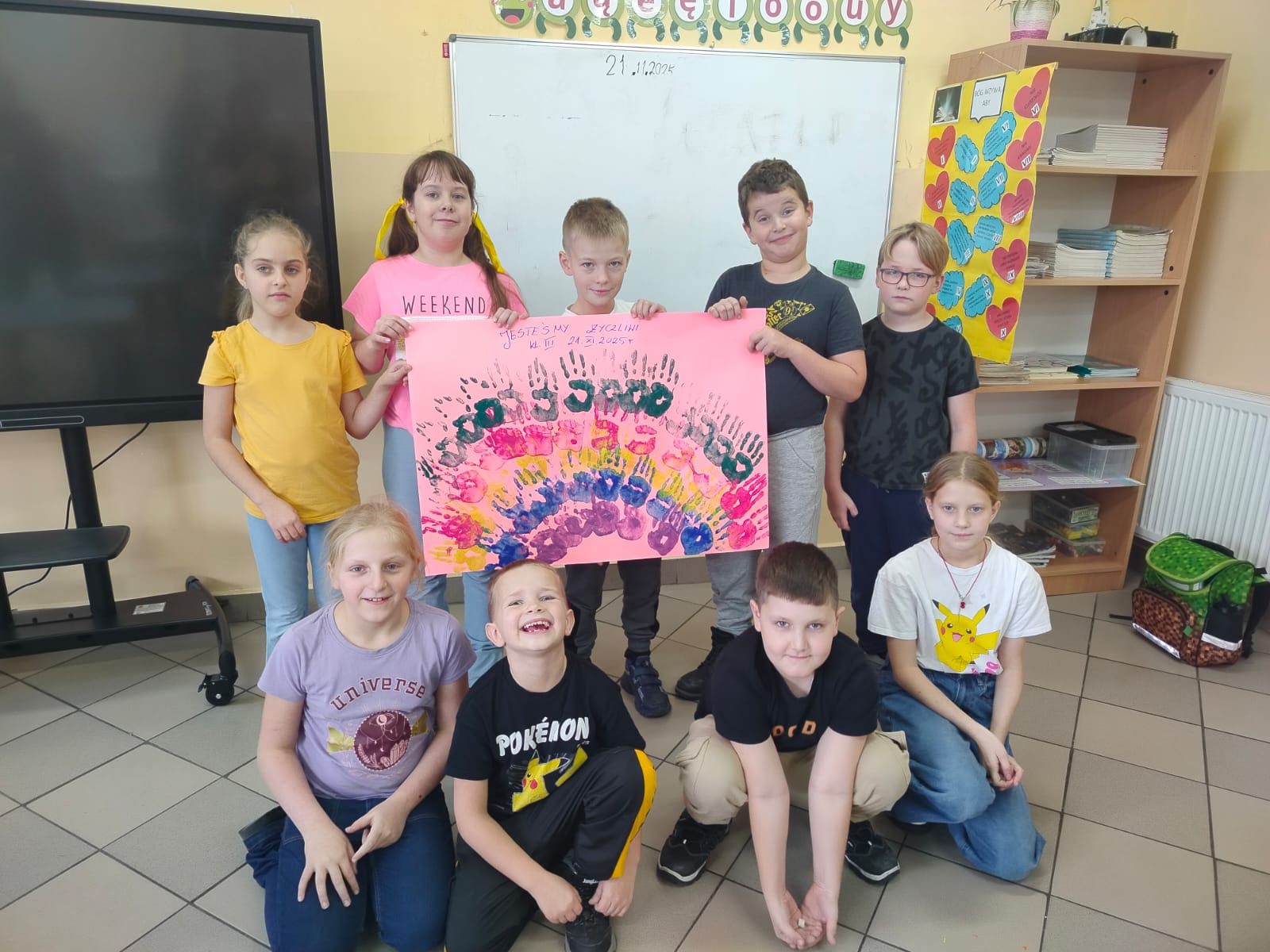 Dzisiaj przedszkolaki i uczniowie wspólnie świętowali Dzień Życzliwości i Pozdrowień. Był to czas pełen uśmiechów, dobrych słów i wspólnej zabawy. Dzieci brały udział w aktywnościach promujących życzliwość, tworzyły drzewa oraz tęcze życzliwości, a także przygotowały łańcuch życzliwości, który symbolicznie połączył nas wszystkich.