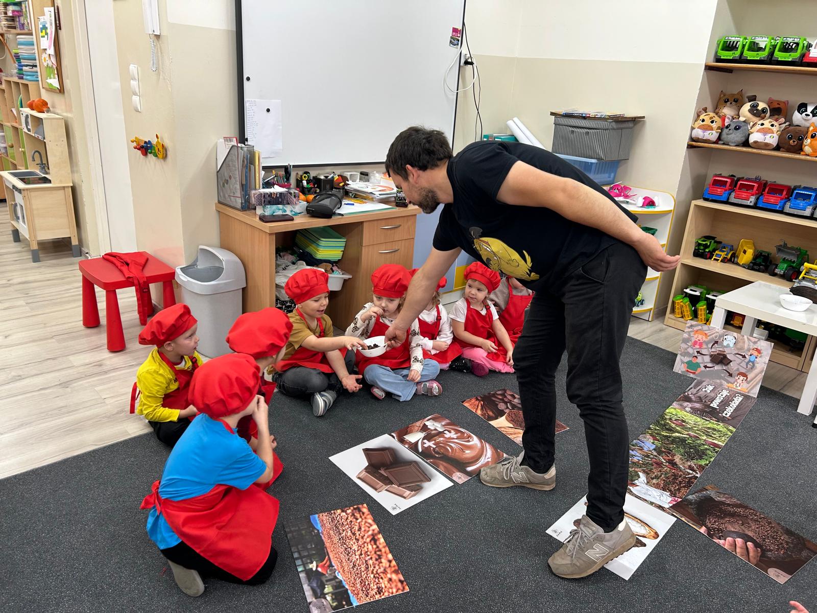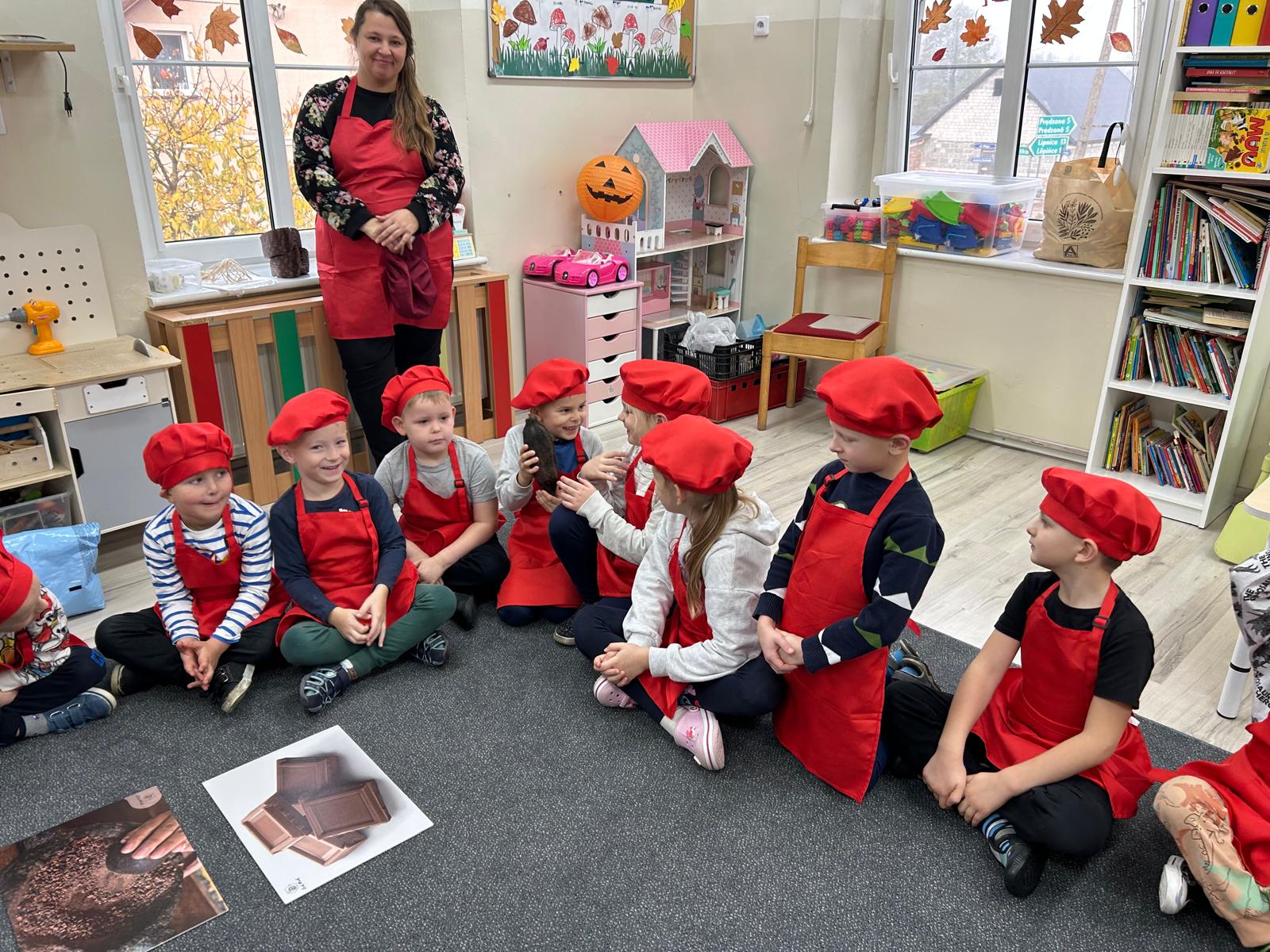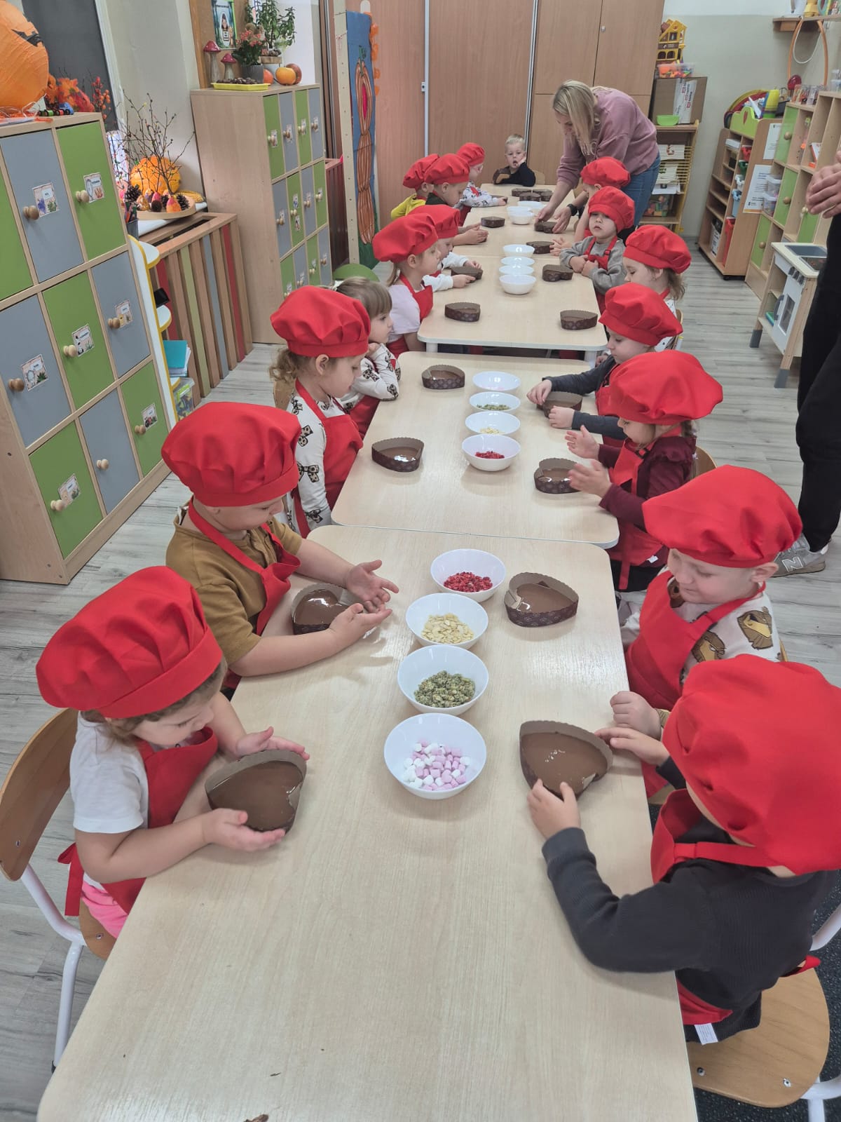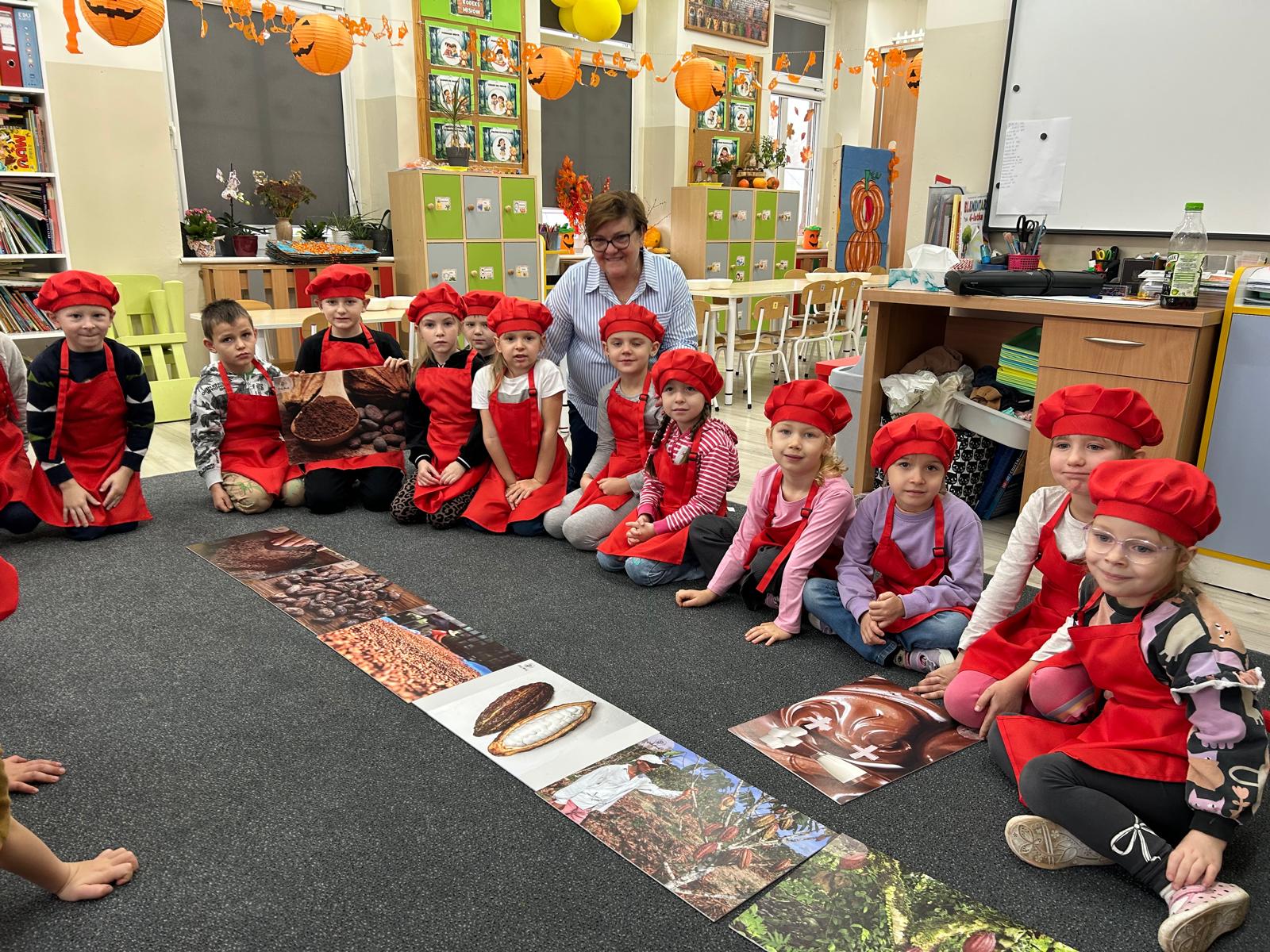 Dziś nasze przedszkolaki wzięły udział w wyjątkowych warsztatach robienia czekolady, które poprowadziła Zagroda Cud Miód. Dzieci poznały fascynującą historię powstania czekolady, zobaczyły prawdziwe ziarna kakaowca, a następnie — z wielkim zaangażowaniem i radością — przygotowały własne tabliczki czekolady z ulubionymi dodatkami.