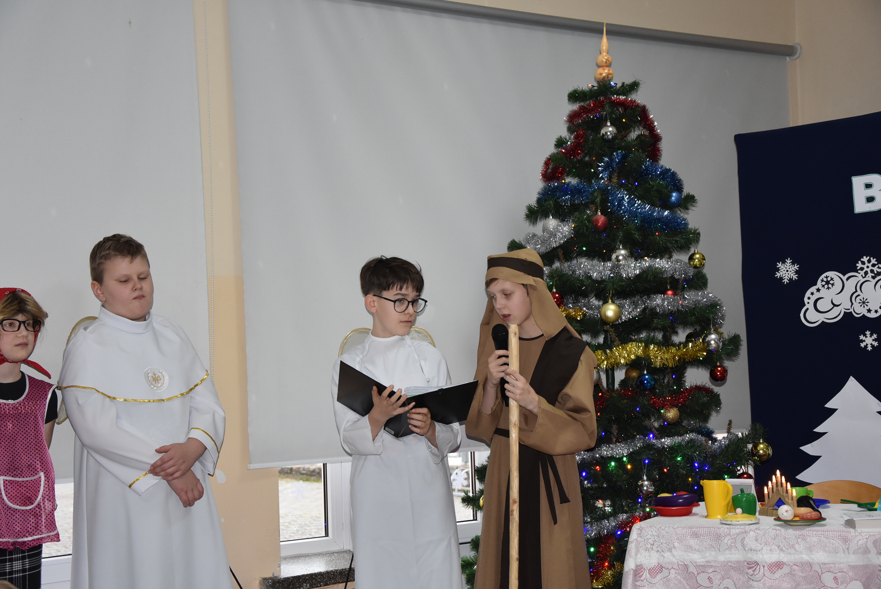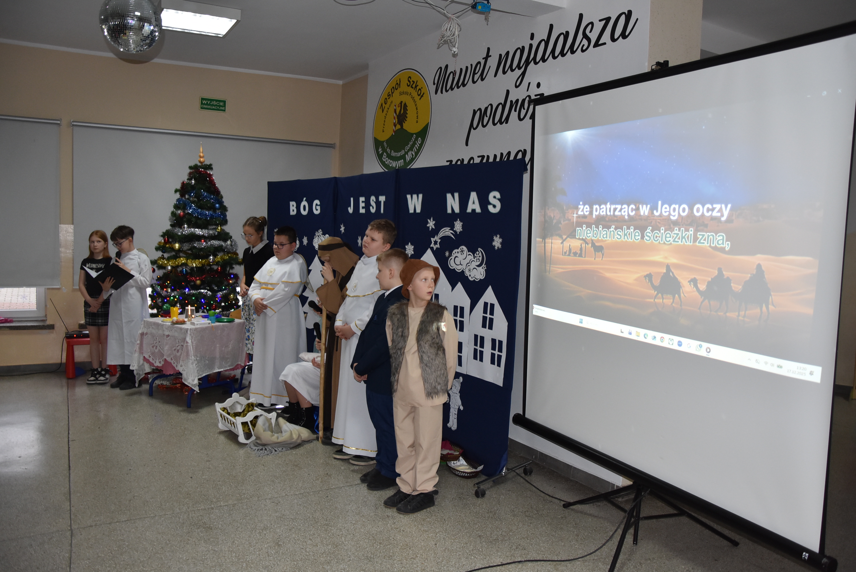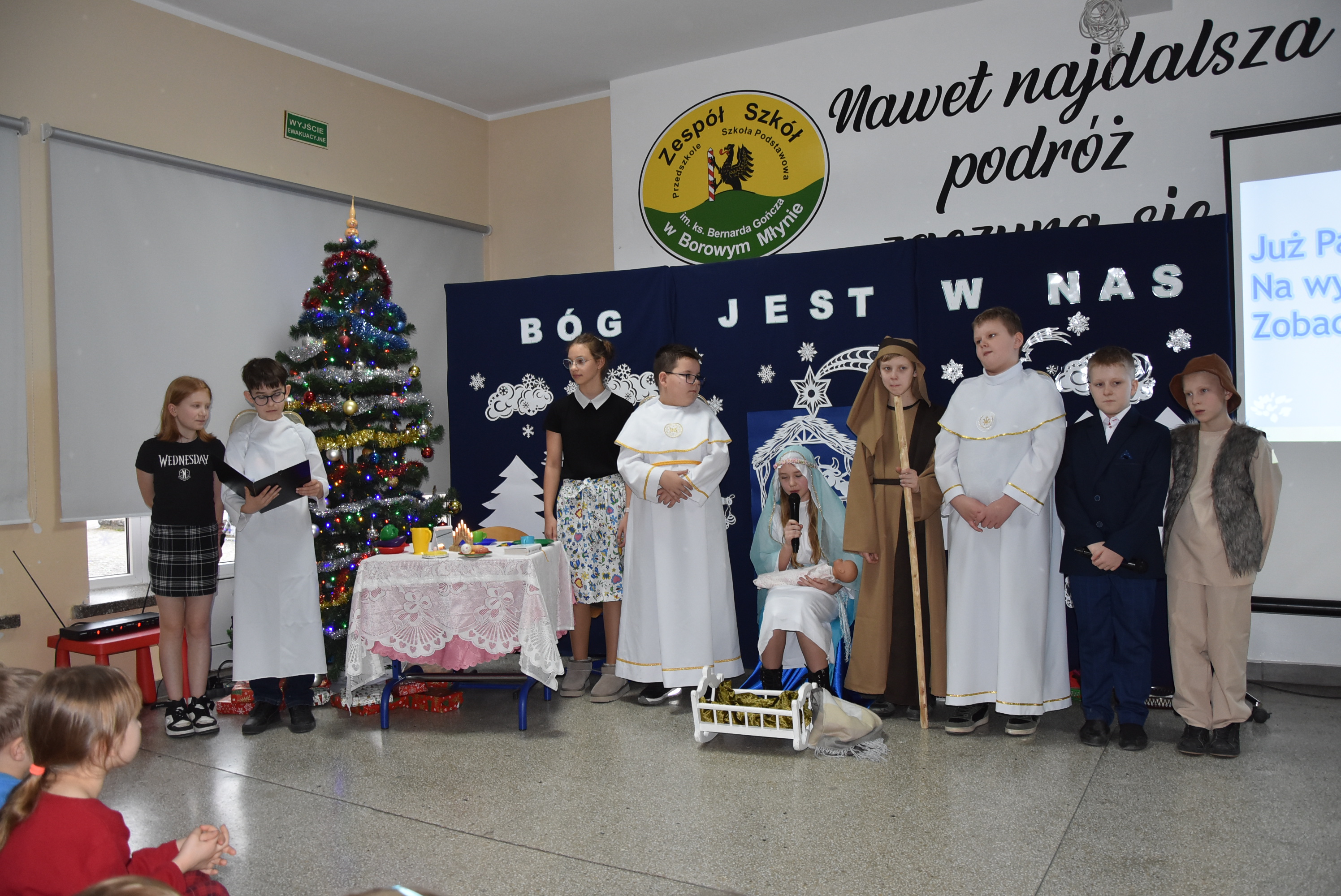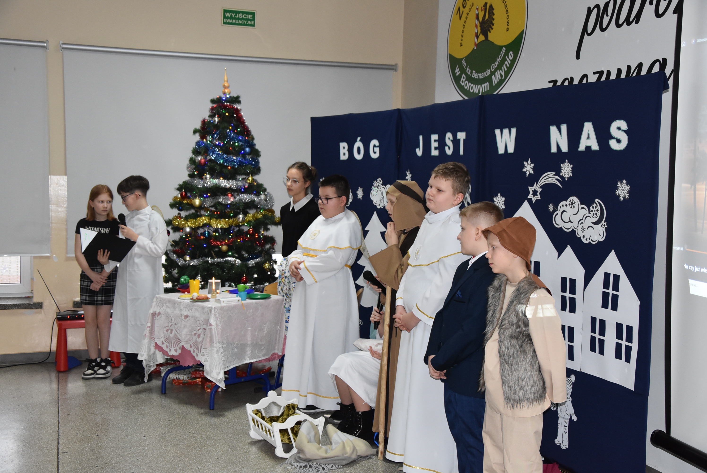 Podczas wydarzenia uczniowie z klasy IV zaprezentowali całej społeczności szkolnej oraz zaproszonym gościom wyjątkowe przedstawienie bożonarodzeniowe pt. „Czekanie na Boga”.