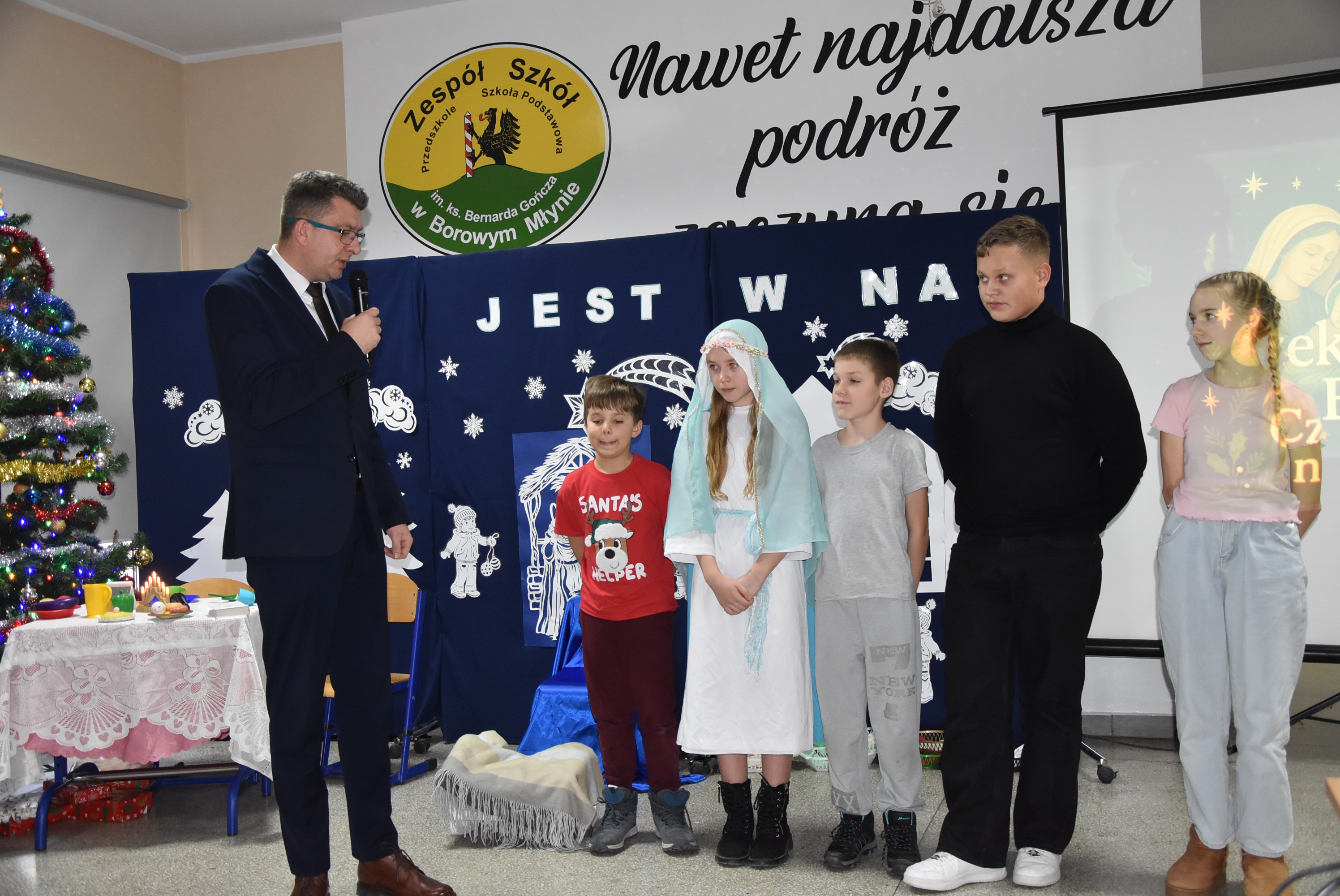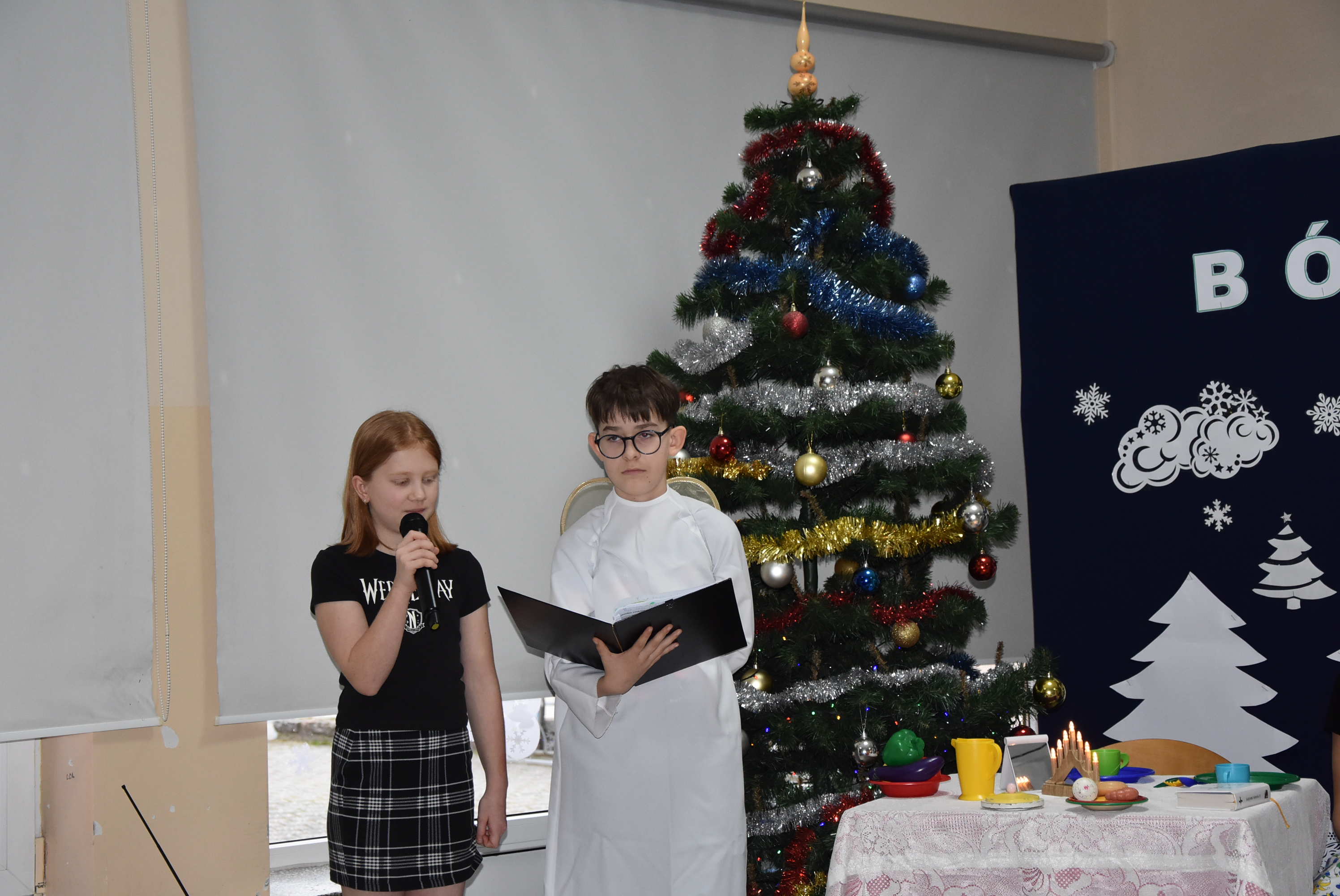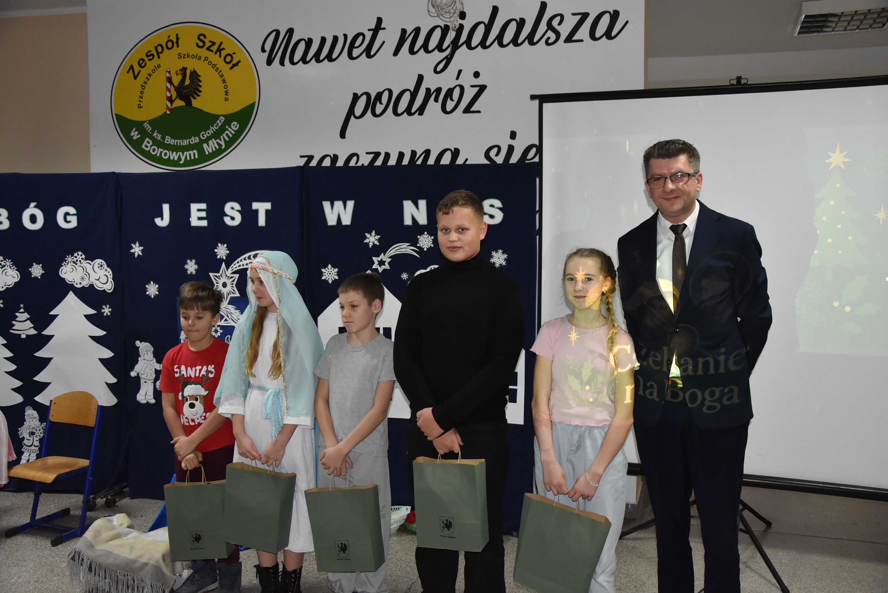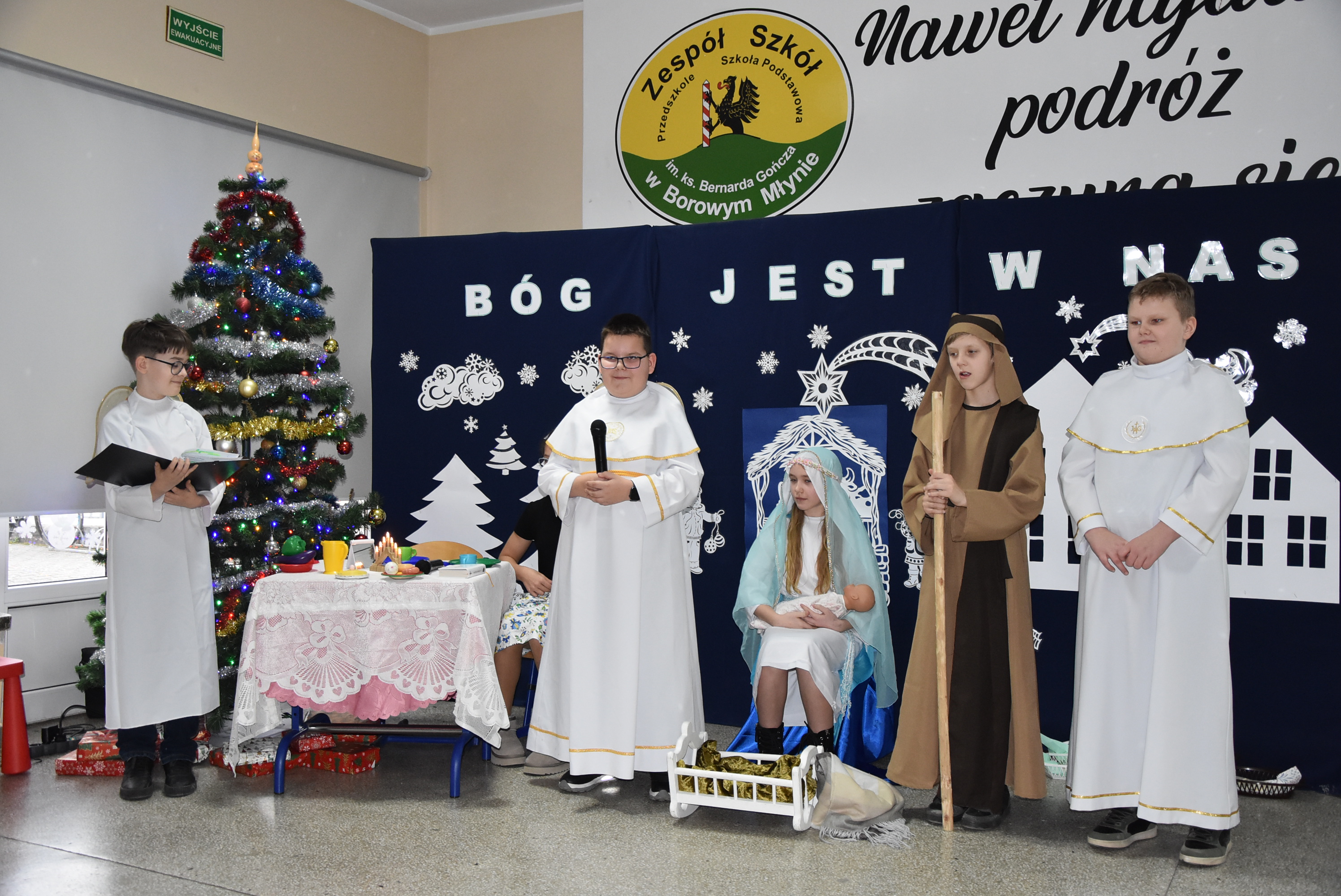Podczas wydarzenia uczniowie z klasy IV zaprezentowali całej społeczności szkolnej oraz zaproszonym gościom wyjątkowe przedstawienie bożonarodzeniowe pt. „Czekanie na Boga”.