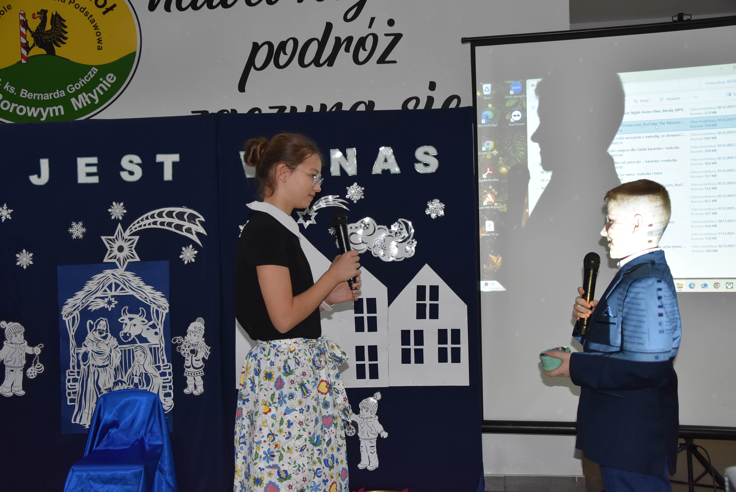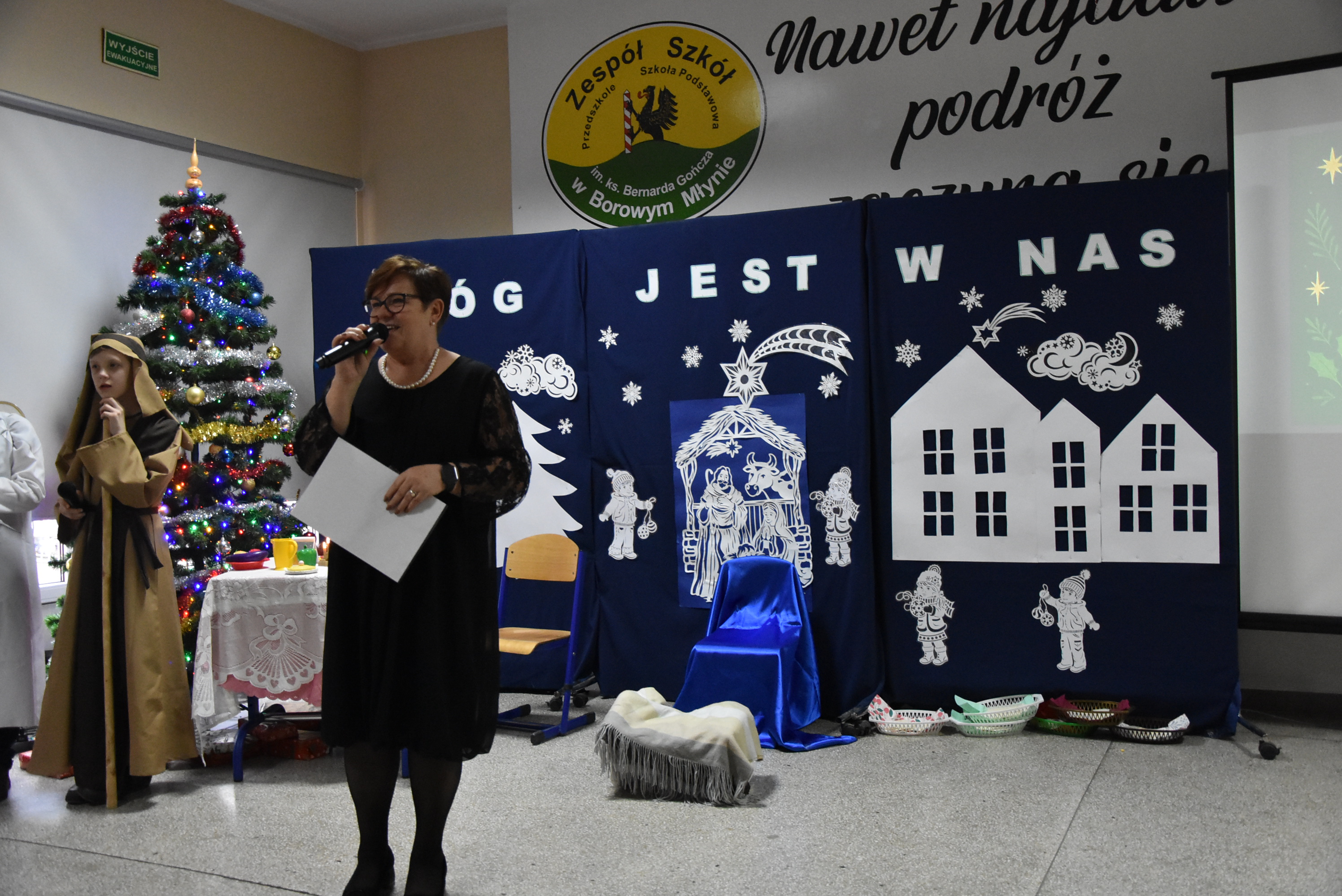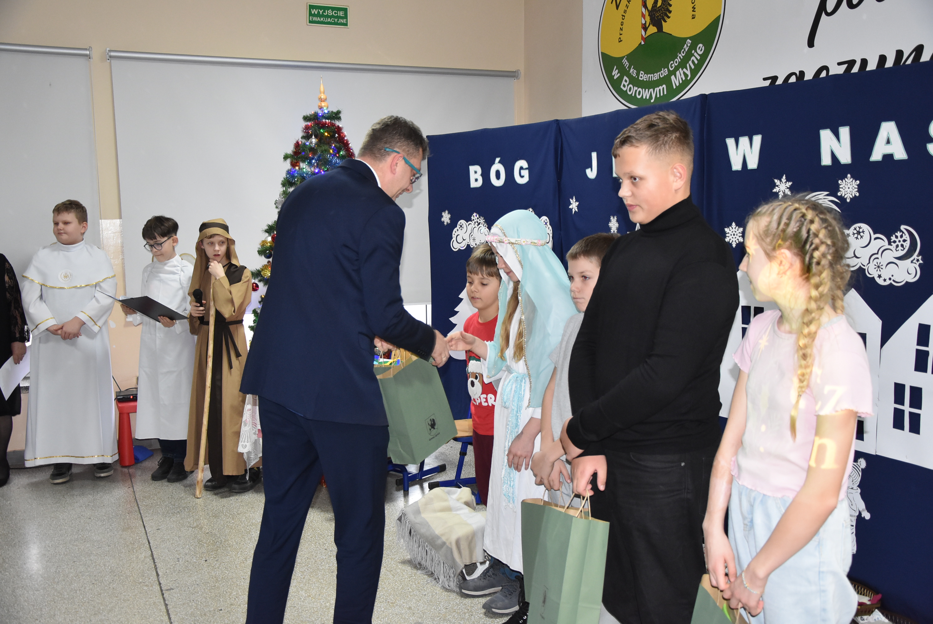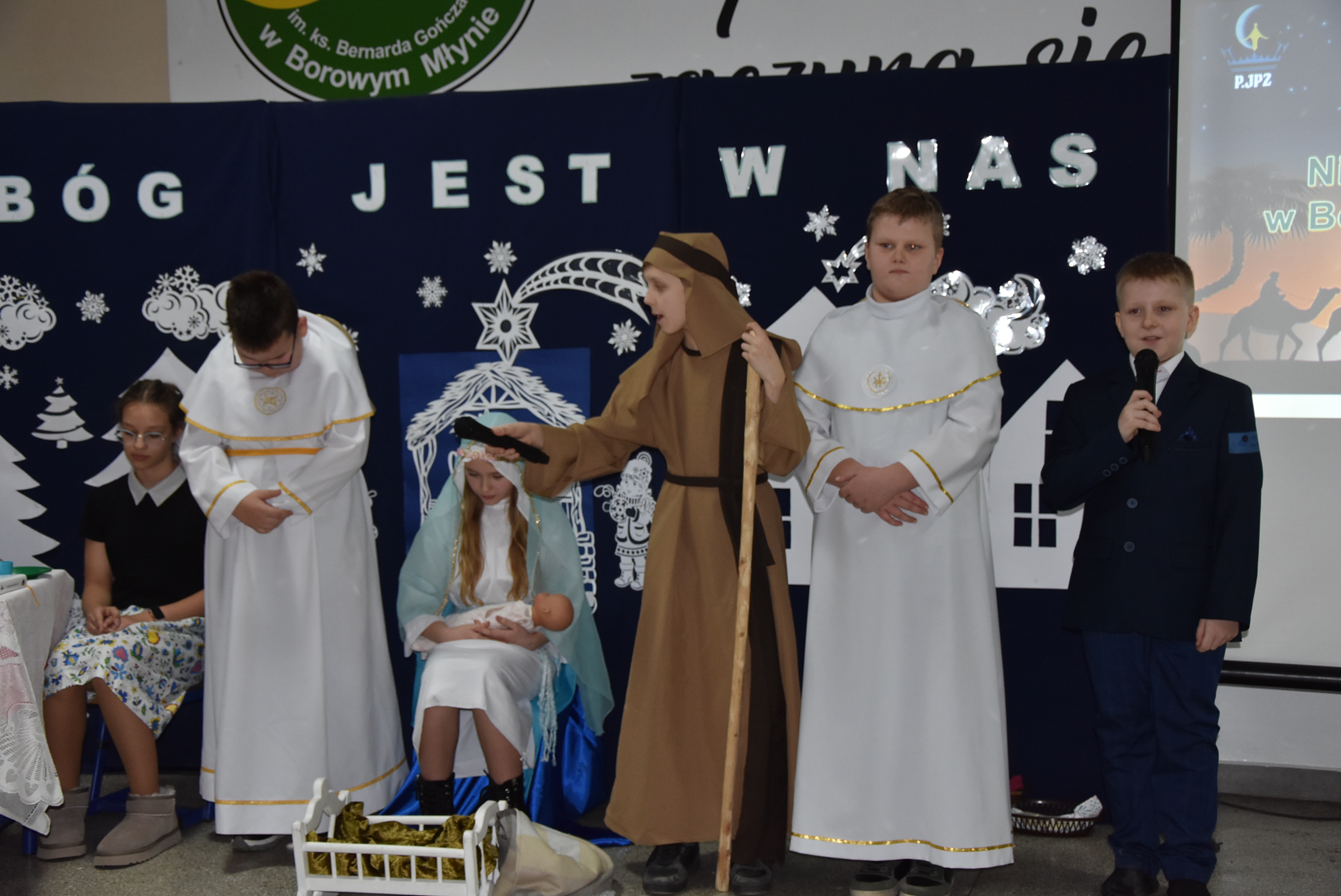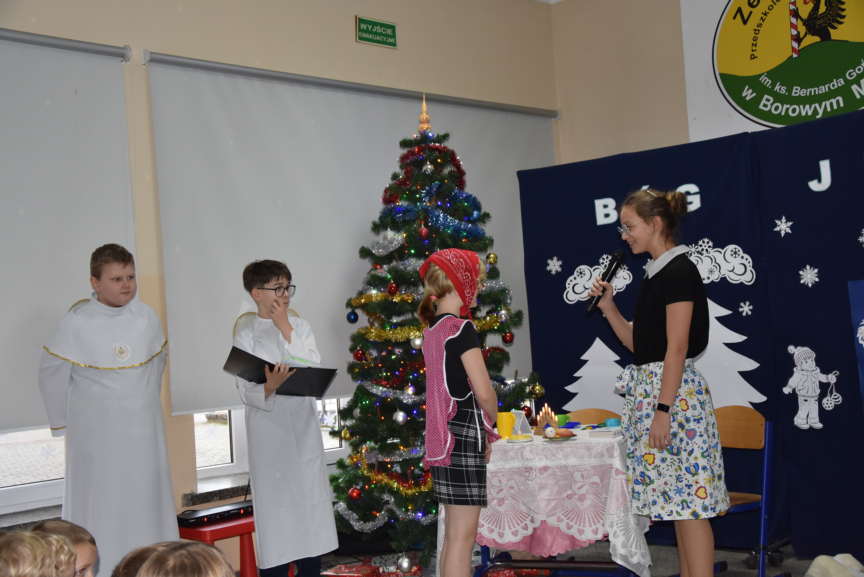 Podczas wydarzenia uczniowie z klasy IV zaprezentowali całej społeczności szkolnej oraz zaproszonym gościom wyjątkowe przedstawienie bożonarodzeniowe pt. „Czekanie na Boga”.