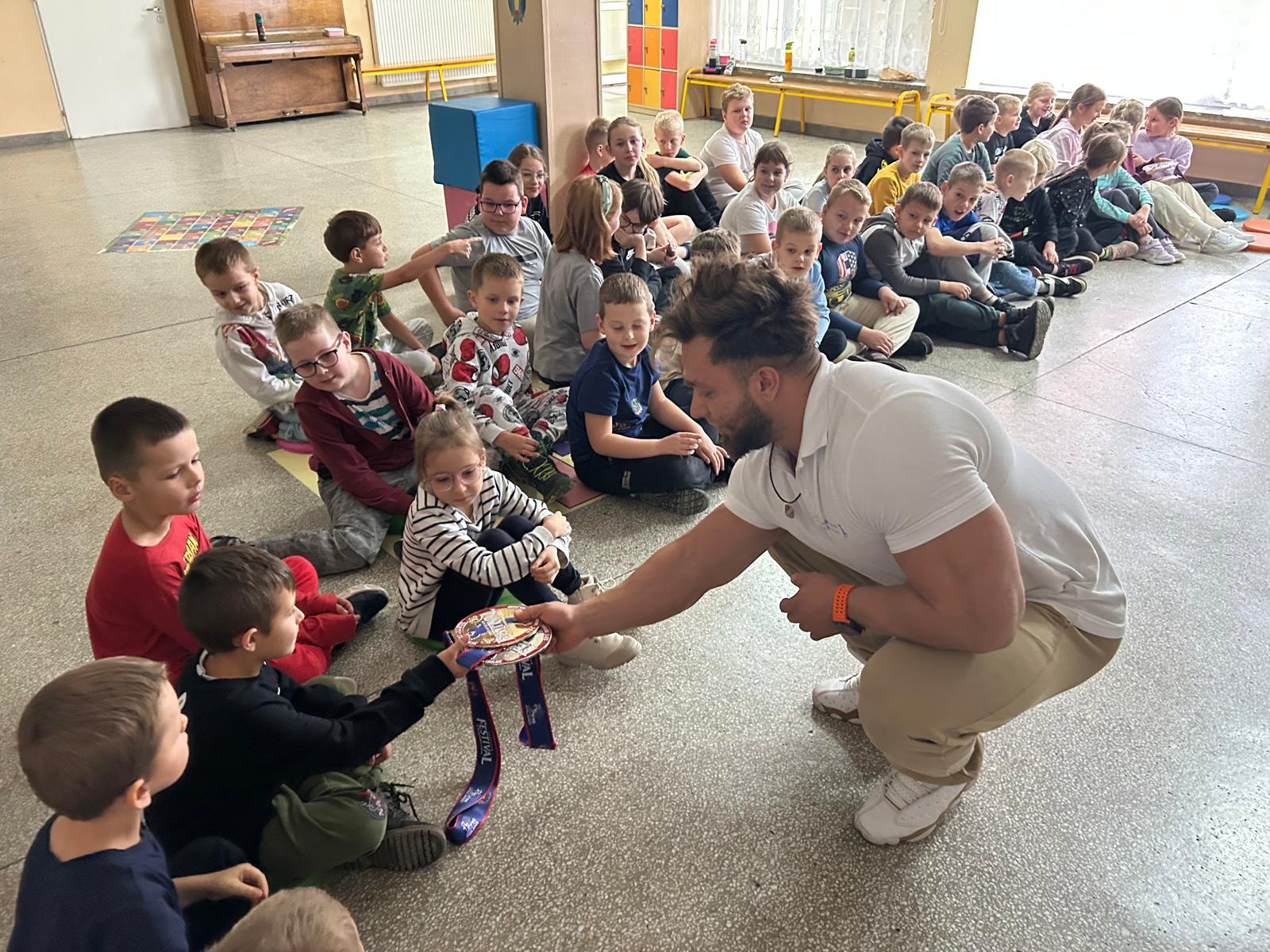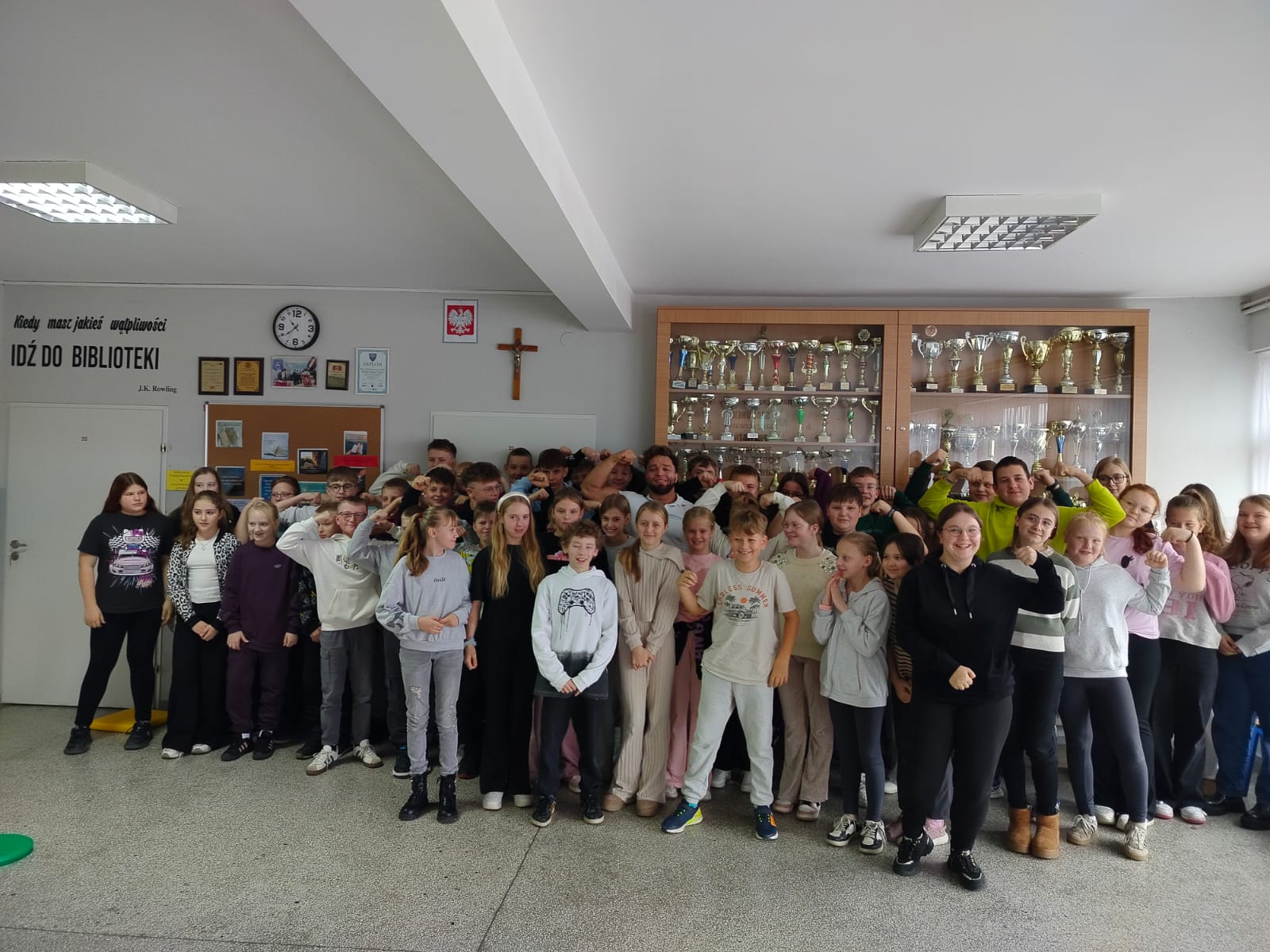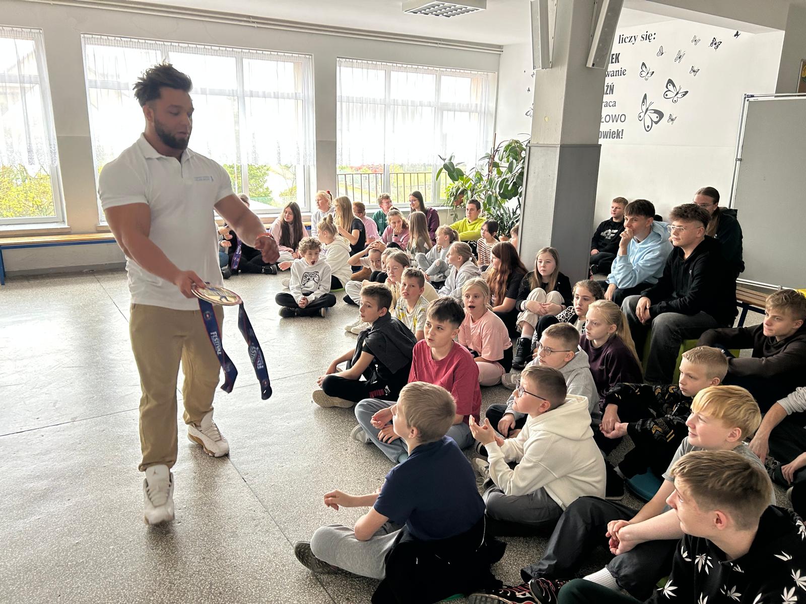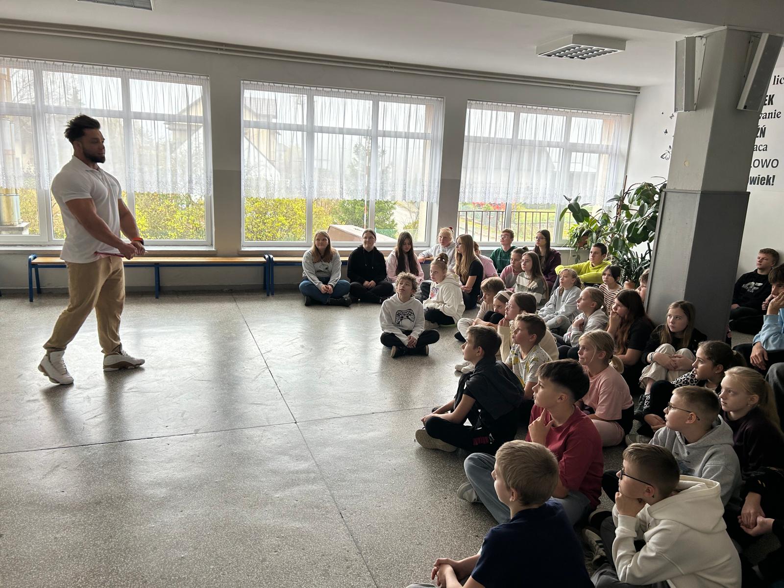 Nie zabrakło też praktyki – uczniowie mogli sprawdzić się podczas rozgrzewki prowadzonej przez mistrza. Było trochę potu, mnóstwo śmiechu i jeszcze więcej motywacji do działania!
