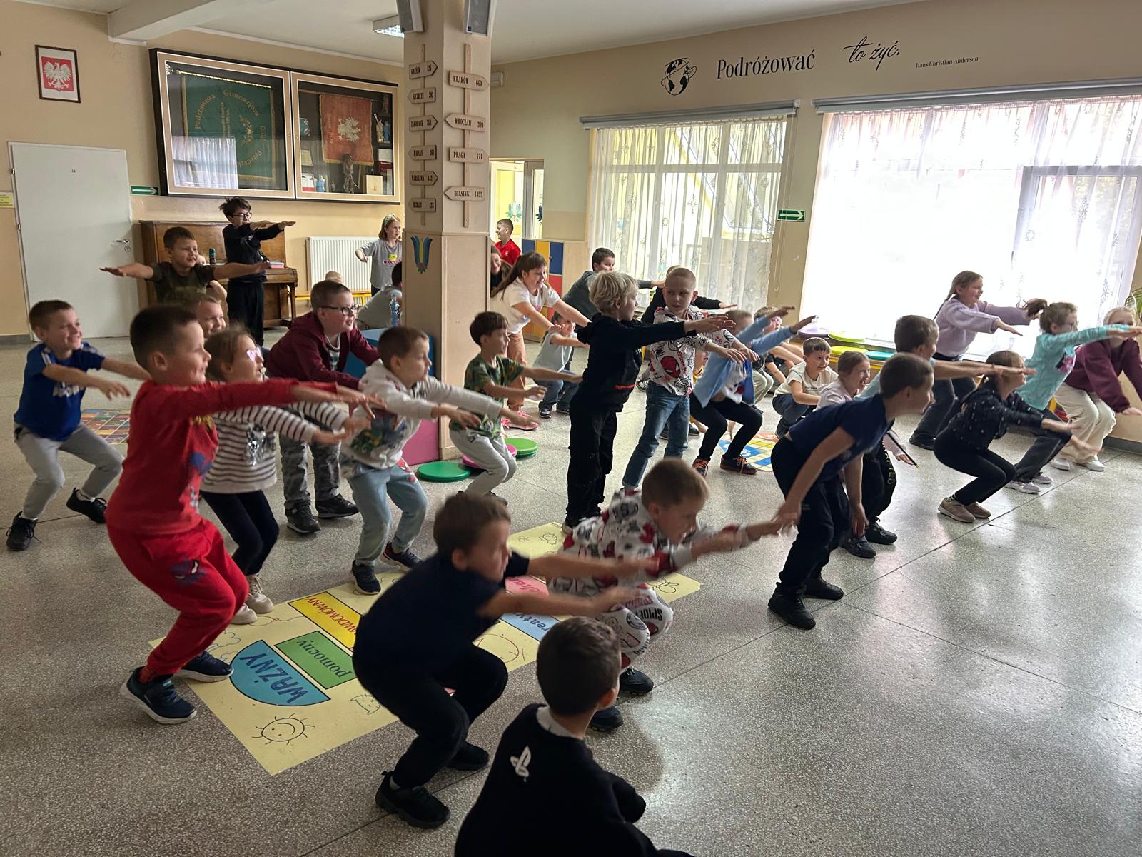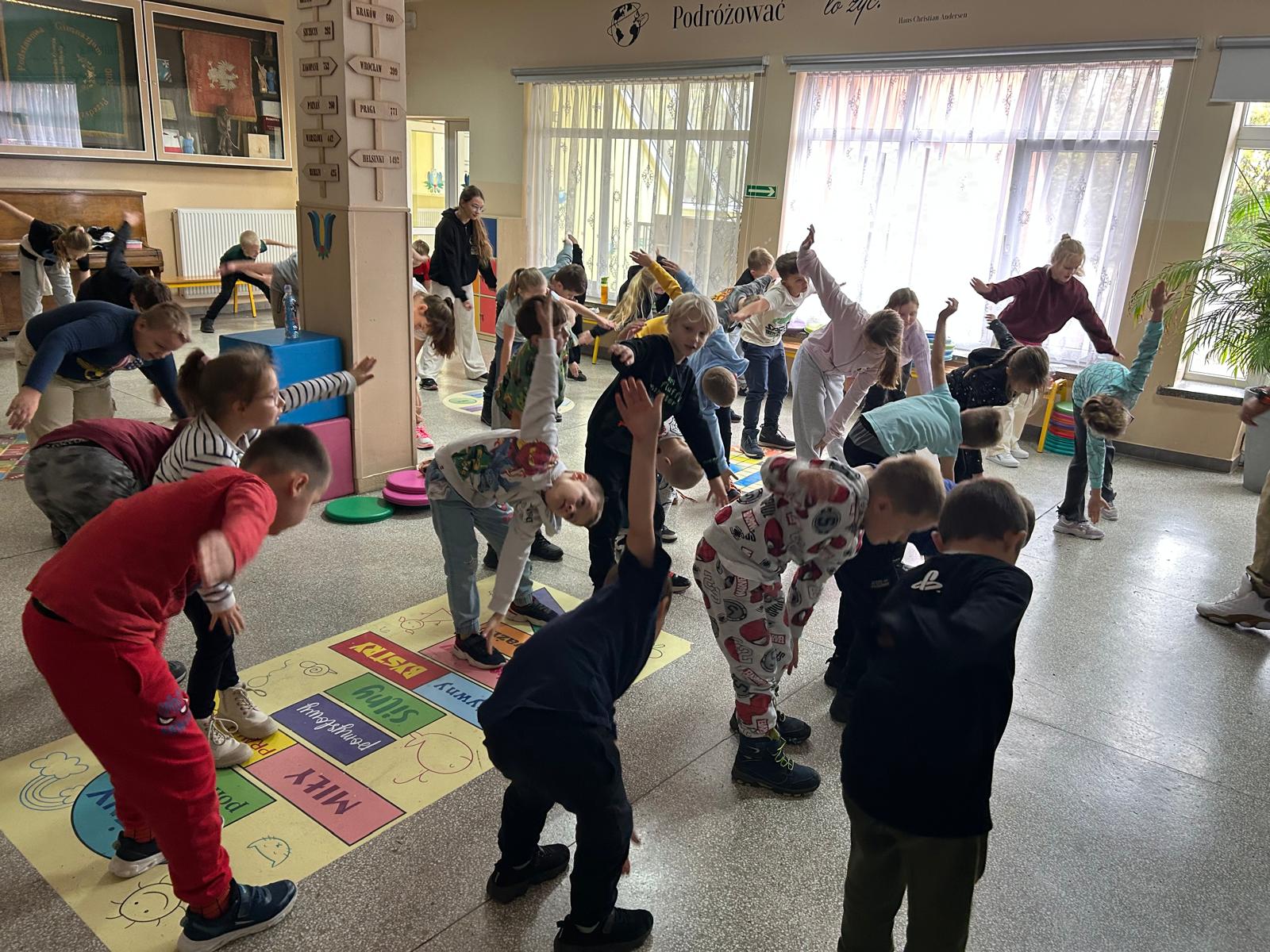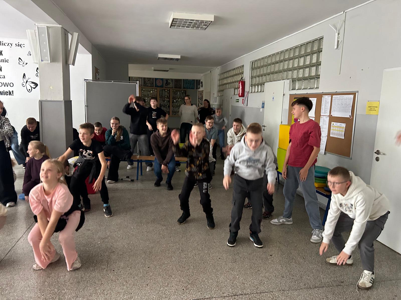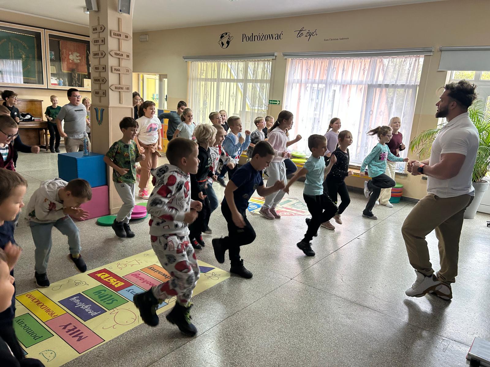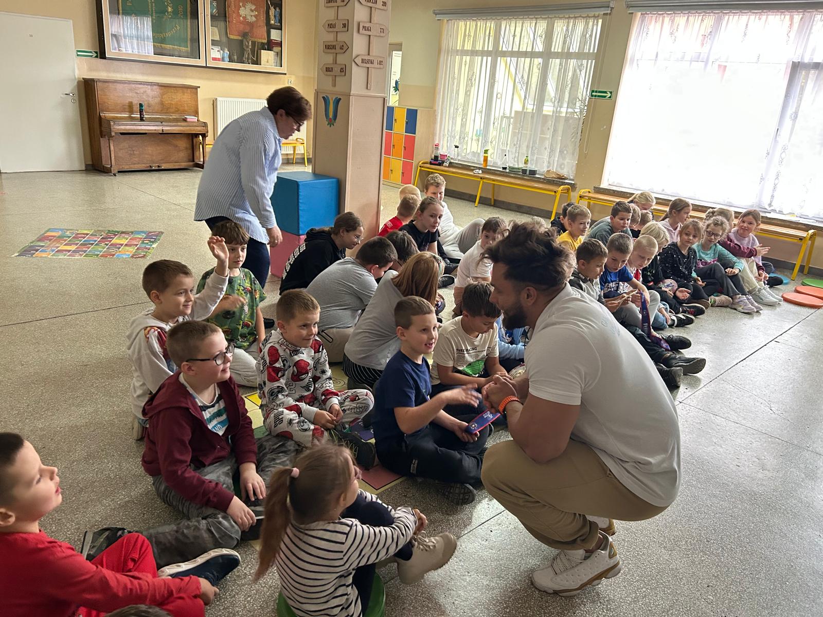 Nie zabrakło też praktyki – uczniowie mogli sprawdzić się podczas rozgrzewki prowadzonej przez mistrza. Było trochę potu, mnóstwo śmiechu i jeszcze więcej motywacji do działania!