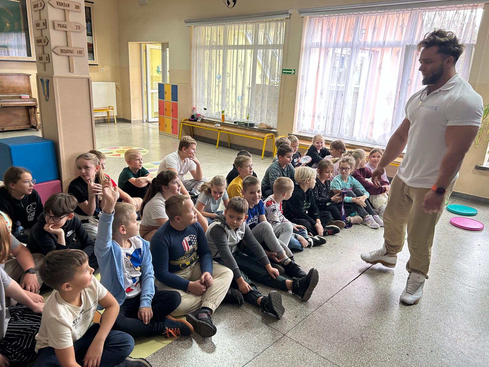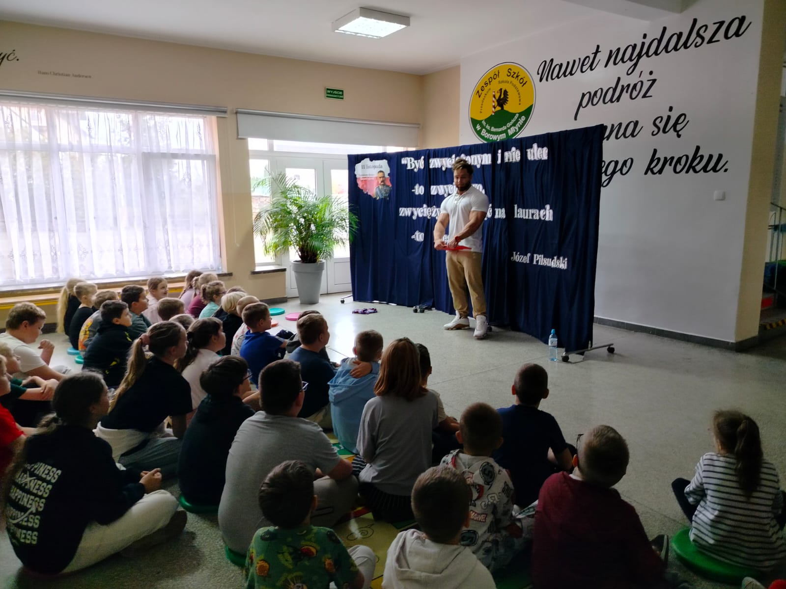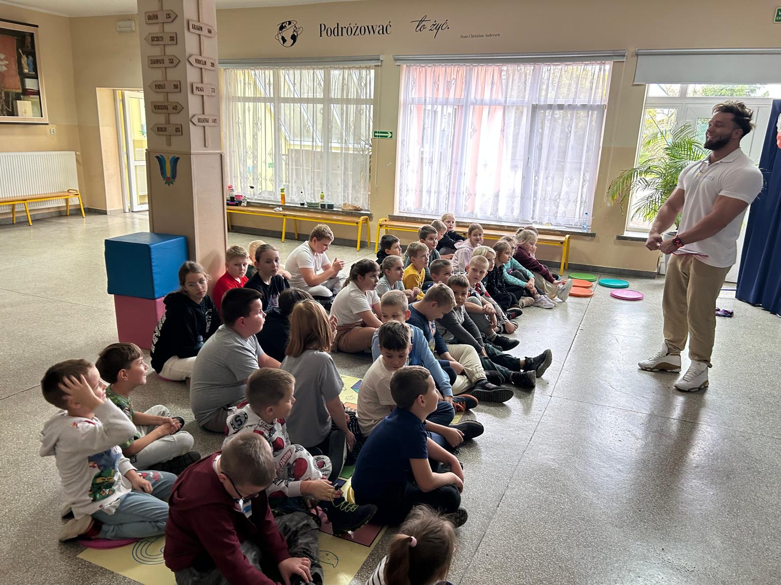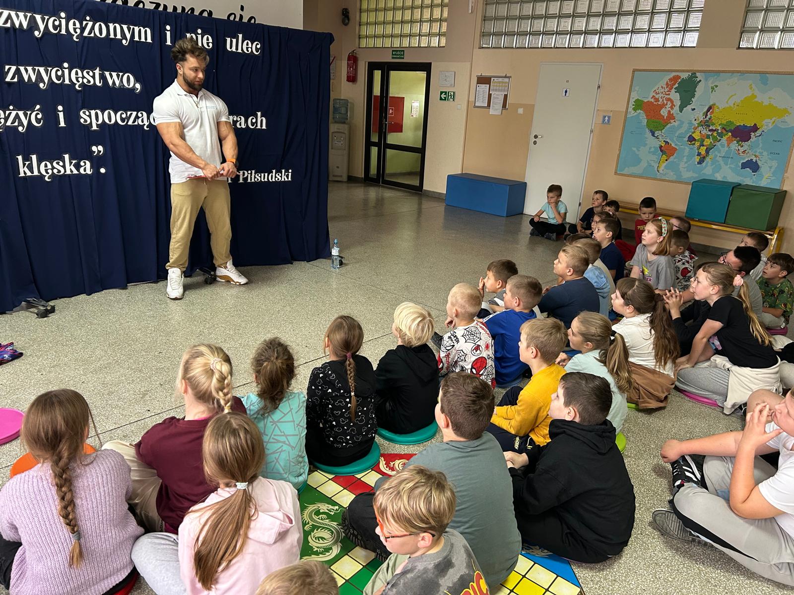 Odwiedził nas wyjątkowy gość – Dwukrotny Mistrz Polski w kulturystyce, student fizjoterapii, miłośnik zdrowego stylu życia. Opowiedział uczniom klas I–VIII o swojej pracy, pasji i o tym, że na superformę składają się trzy magiczne filary: ruch, dobra dieta i… porządny sen (czyli coś, co wszyscy lubimy najbardziej).